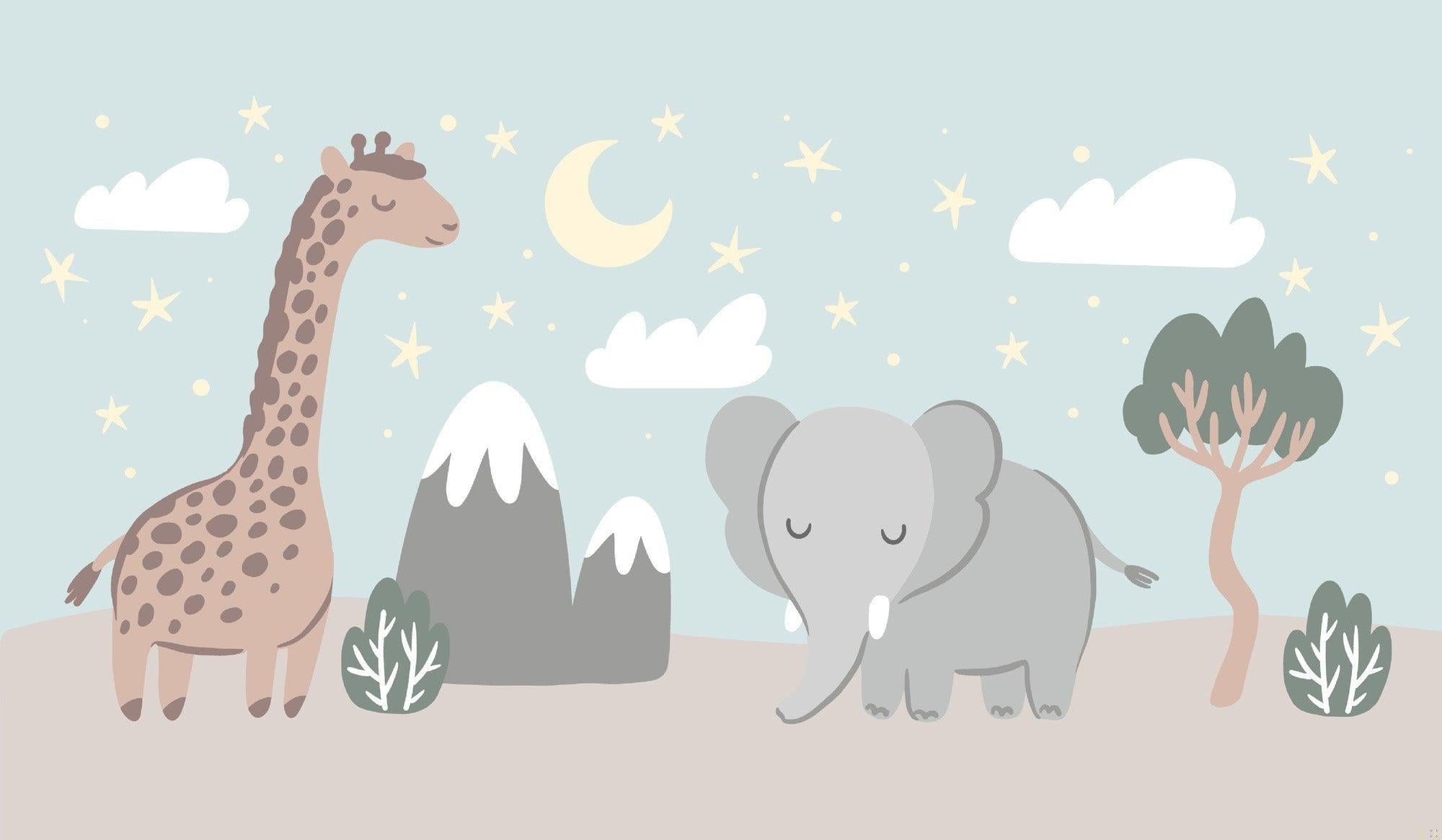 Ce papier peint animalier safari crée une scène nocturne enchanteresse avec des teintes pastel douces et des personnages charmants. Une girafe amicale et un éléphant paisible se tiennent devant des montagnes enneigées, tandis que des nuages doux et des étoiles dorées dansent à travers un ciel serein de couleur menthe. Le papier peint animalier pour chambre d'enfant présente des détails délicats comme des arbres fantaisistes et des nuages blancs duveteux, le tout rendu dans une palette de couleurs moderne et apaisante.