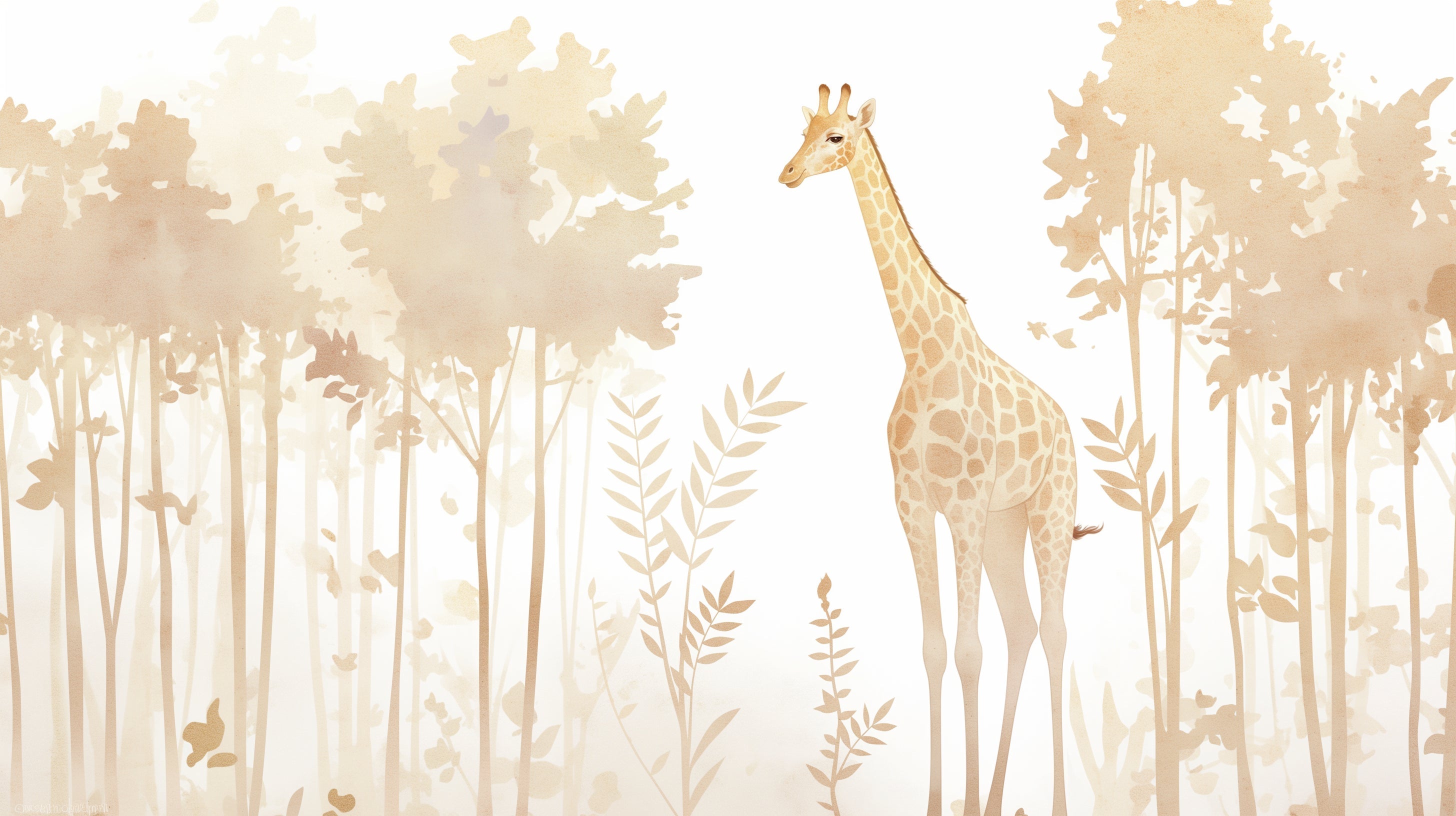 Ce papier peint girafe safari capture une scène sereine de savane rendue dans des tons sophistiqués d'aquarelle beige. Une girafe majestueuse se dresse contre un fond blanc, son motif tacheté délicatement détaillé dans des nuances chaudes de miel. Autour de la figure centrale, des arbres éthérés créent une silhouette forestière douce, tandis que des éléments botaniques gracieux ajoutent un mouvement subtil grâce à des feuilles et des tiges soigneusement placées dans des teintes champagne douces.
