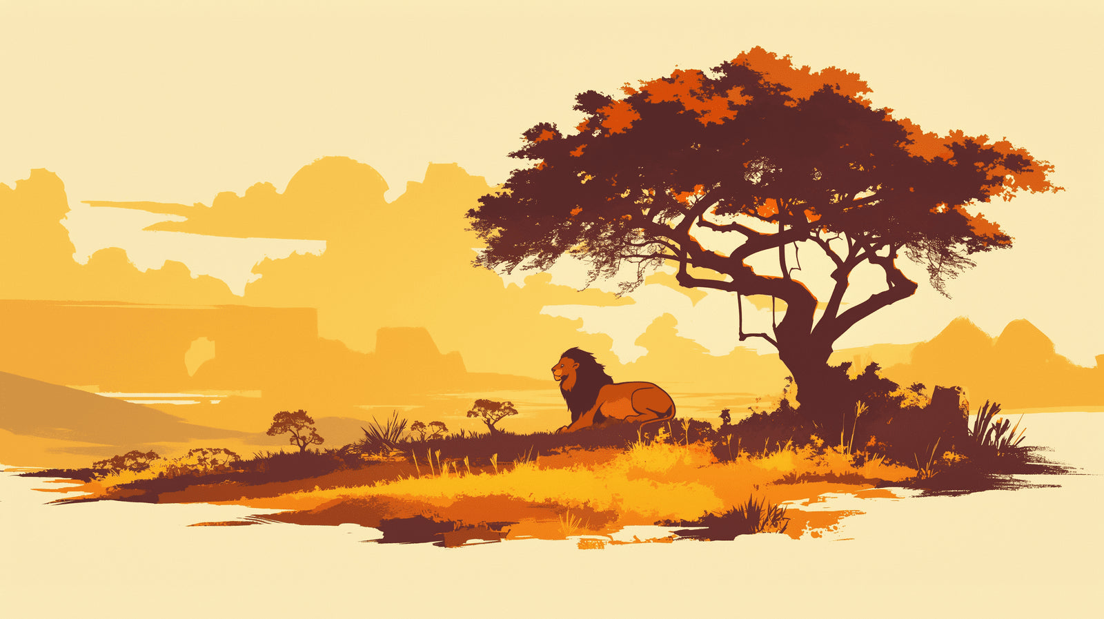Cette papier peint mural safari capture la majesté de la savane africaine à l'heure dorée. Un noble lion se repose sous un acacia ancien, silhouetté contre un ciel de coucher de soleil spectaculaire peint en riches tons d'ambre et d'or. La composition dramatique présente des tons chauds de terre cuite et des ombres bordeaux profondes qui créent de la profondeur, tandis que les vastes prairies et les montagnes lointaines établissent un sentiment de nature sauvage vaste et indomptée dans ce papier peint faune africaine.