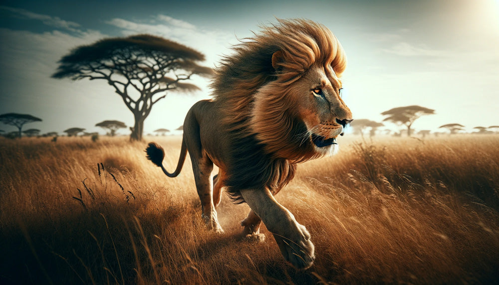 Ce Papier peint lion africain capture la puissance brute et la majesté du prédateur le plus emblématique de la nature en mouvement. Sur fond de savane baignée de soleil, la crinière du magnifique lion, balayée par le vent, capte la lumière dorée tandis que les acacias se dressent en sentinelles au loin. Le papier peint safari présente un détail extraordinaire dans chaque aspect, de la forme musclée du lion aux herbes ambrées ondulant sous la brise africaine.