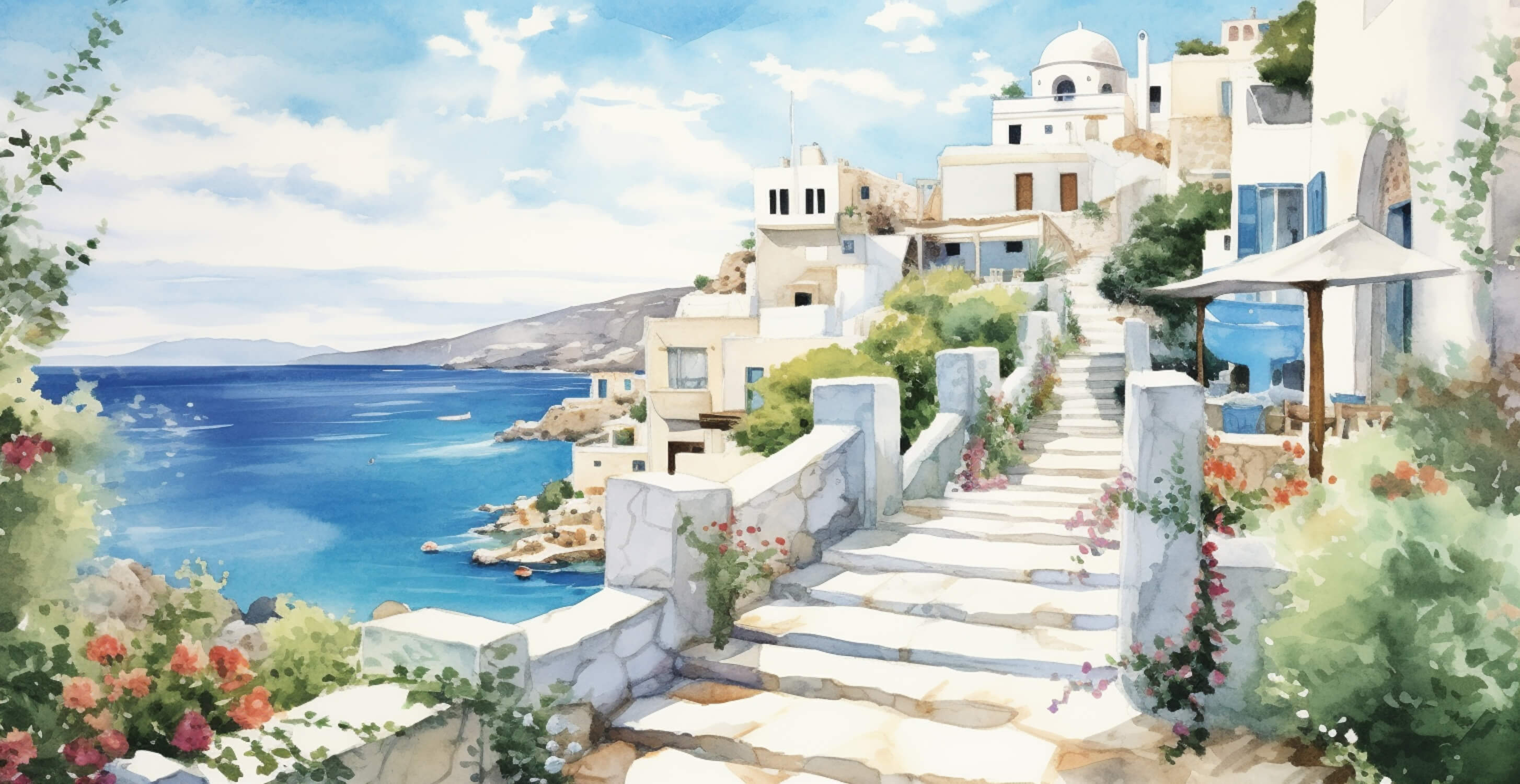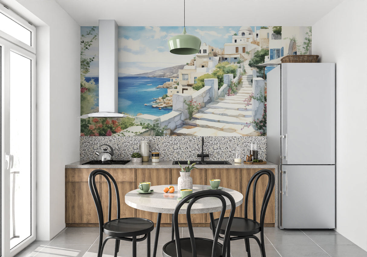Papier Peint Mural Santorin | Paysage Méditerranéen Aquarelle