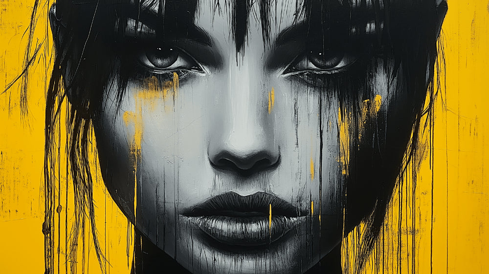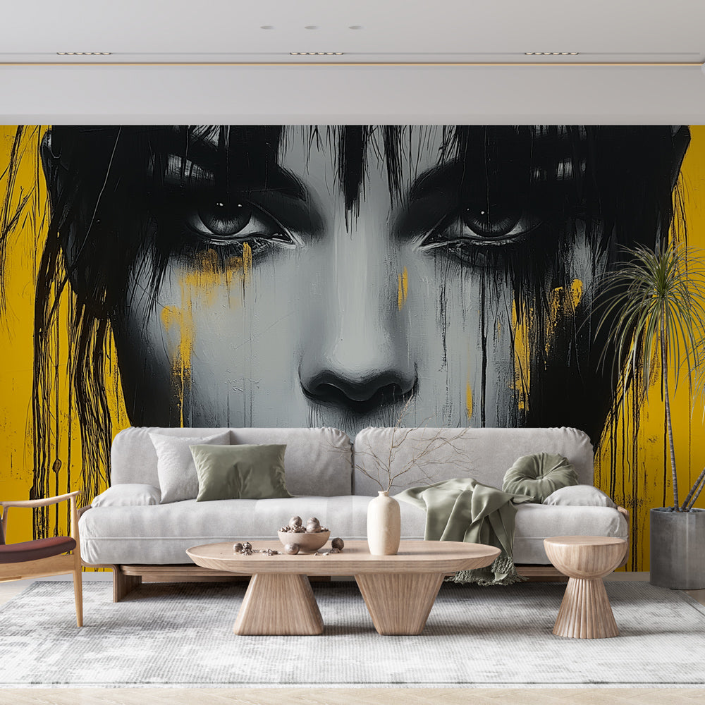 Ce papier peint street art présente un portrait monochromatique saisissant rendu en tons dramatiques de noir et de gris sur un fond jaune vibrant. La composition artistique met en avant des yeux expressifs et des traits du visage détaillés, renforcés par des coulures de peinture dynamiques qui créent une fusion captivante des esthétiques du papier peint art urbain. Le contraste intentionnel entre le détail net et les éléments abstraits apporte une touche contemporaine au design, tandis que les éclaboussures de jaune s’intègrent parfaitement dans la composition dramatique.