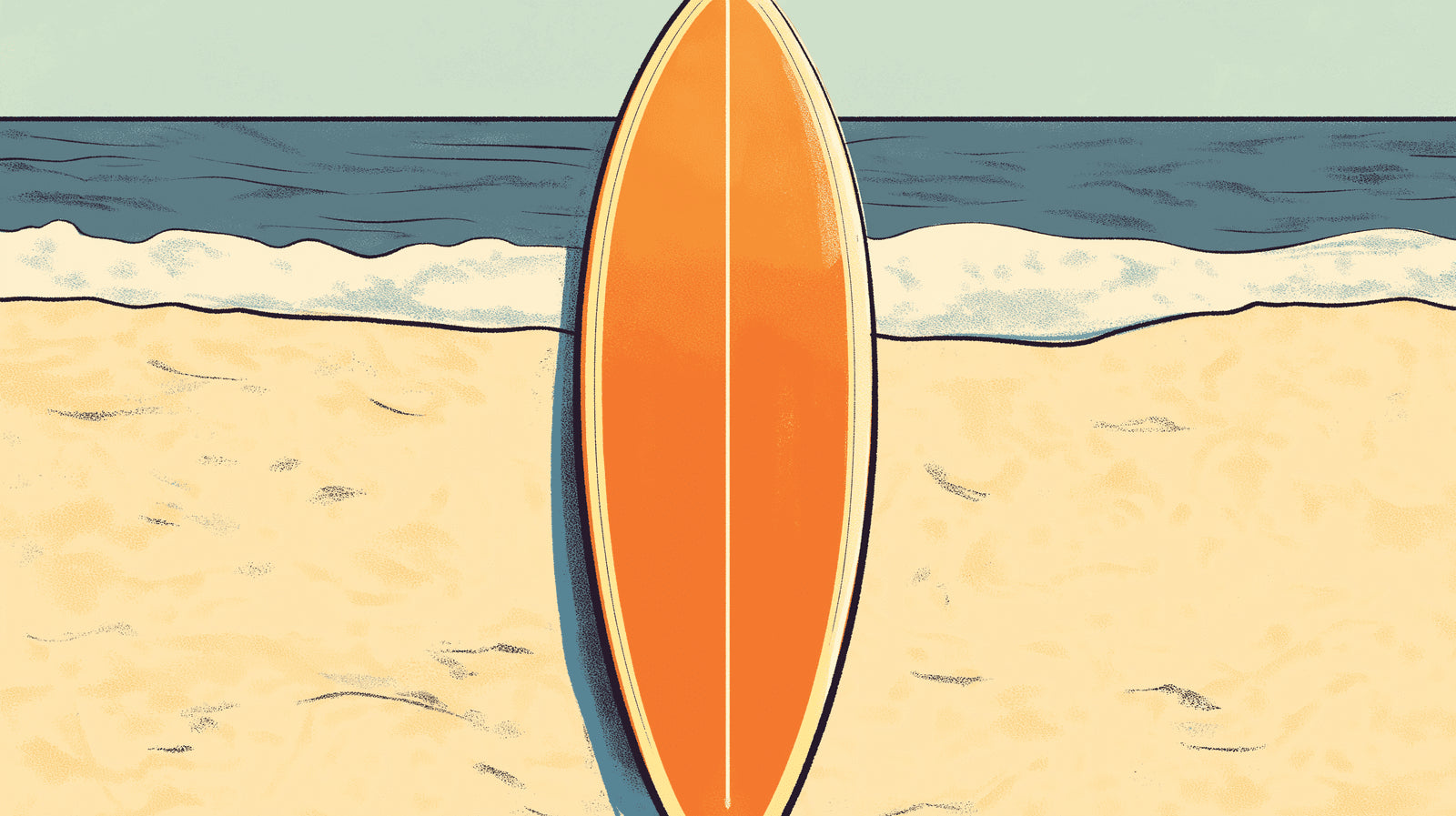 Ce papier peint plage de surf capture l'essence de la vie côtière avec son design minimaliste mais saisissant. Une planche de surf orange vibrante se dresse fièrement sur un fond de sable blanchi par le soleil et d'eaux bleues tranquilles. Le style d'illustration artistique apporte une approche moderne et aux lignes épurées au classique design de fresque murale de plage, avec des textures douces qui ajoutent de la profondeur et de l'authenticité à la scène en bord de mer.