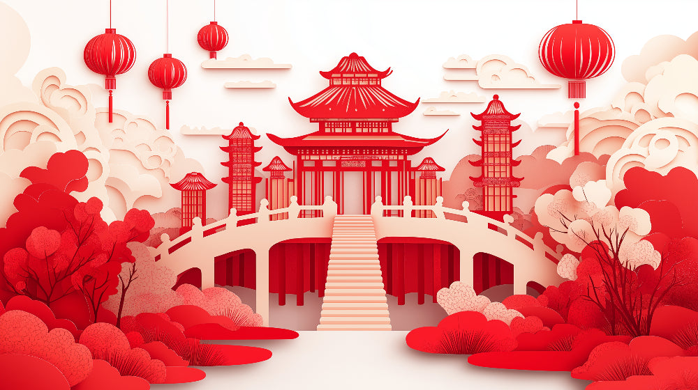 Ce papier peint de temple japonais enchanteur présente une scène artistiquement composée d'architecture traditionnelle dans des teintes rouges saisissantes. La majestueuse pagode centrale s'élève gracieusement, flanquée de tours élégantes et ornée de motifs traditionnels de lanternes chinoises. Le pont voûté menant au temple crée une impression de profondeur, tandis que des nuages rose pâle et un feuillage stylisé encadrent la composition dans une esthétique contemporaine de découpage papier.