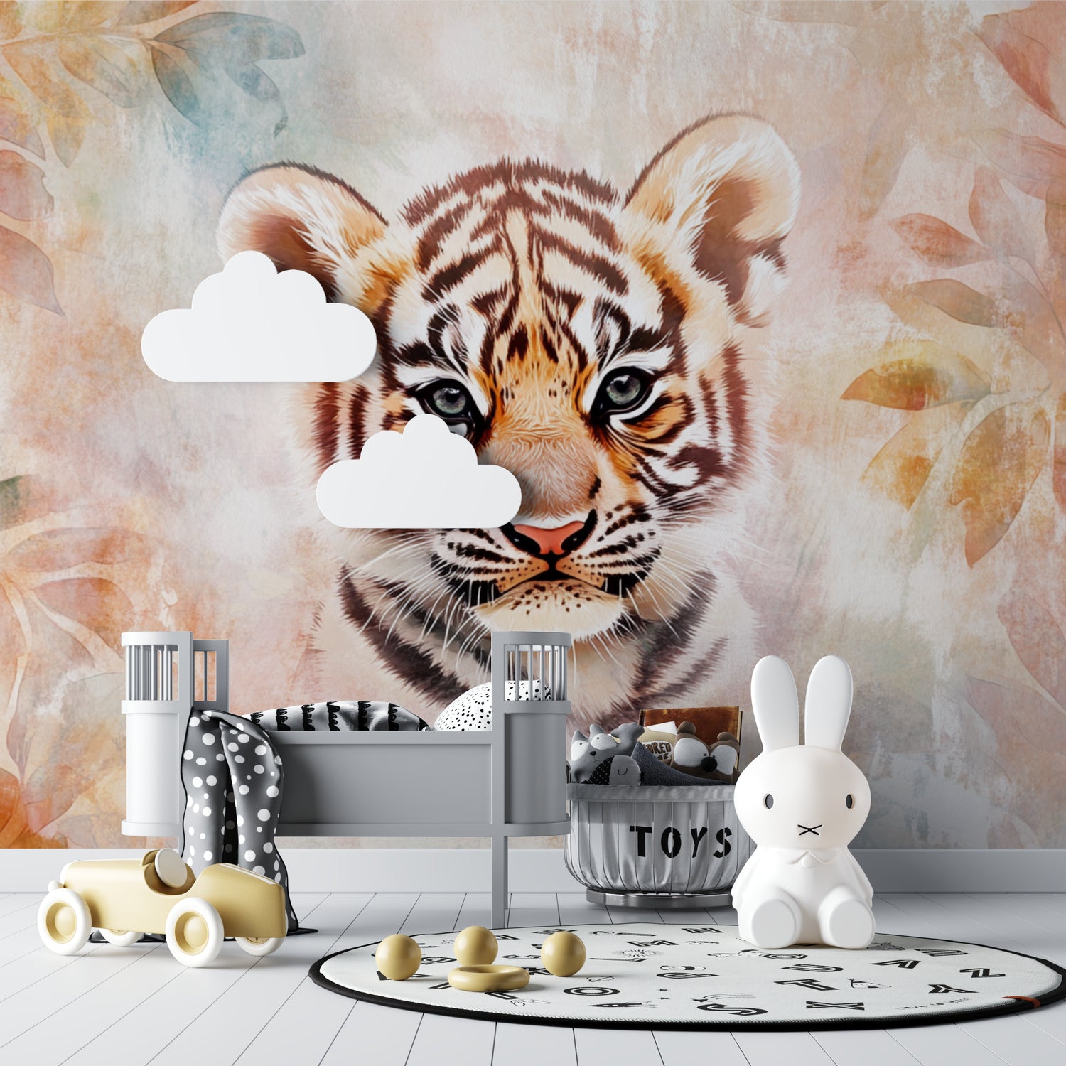 Cette fresque de bébé tigre apporte des couleurs douces et une énergie calme à n'importe quelle pièce.