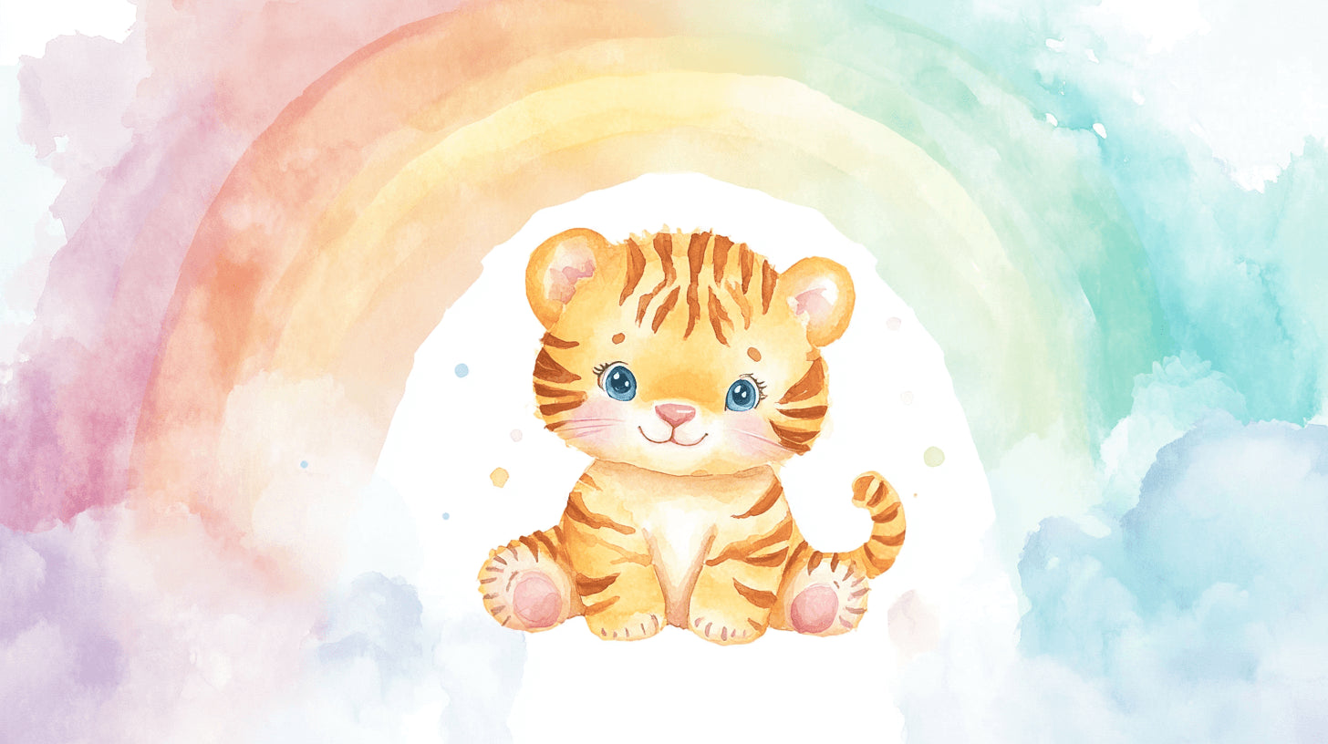 Ce papier peint bébé tigre enchanteur capture le cœur avec son art aquarelle fantaisiste. Le centre présente un adorable tigreau rendu dans des tons dorés doux avec de délicates rayures brunes, sur un fond arc-en-ciel onirique. Le dégradé doux de rose, jaune et vert menthe crée un papier peint animal de la chambre d'enfant qui rayonne de chaleur et de charme, tandis que des étincelles subtiles ajoutent une touche de magie à l'ensemble de la composition.