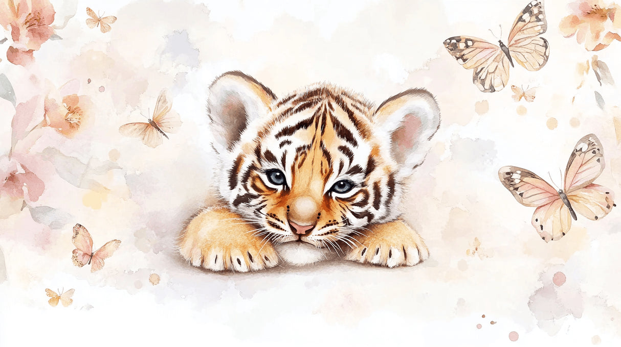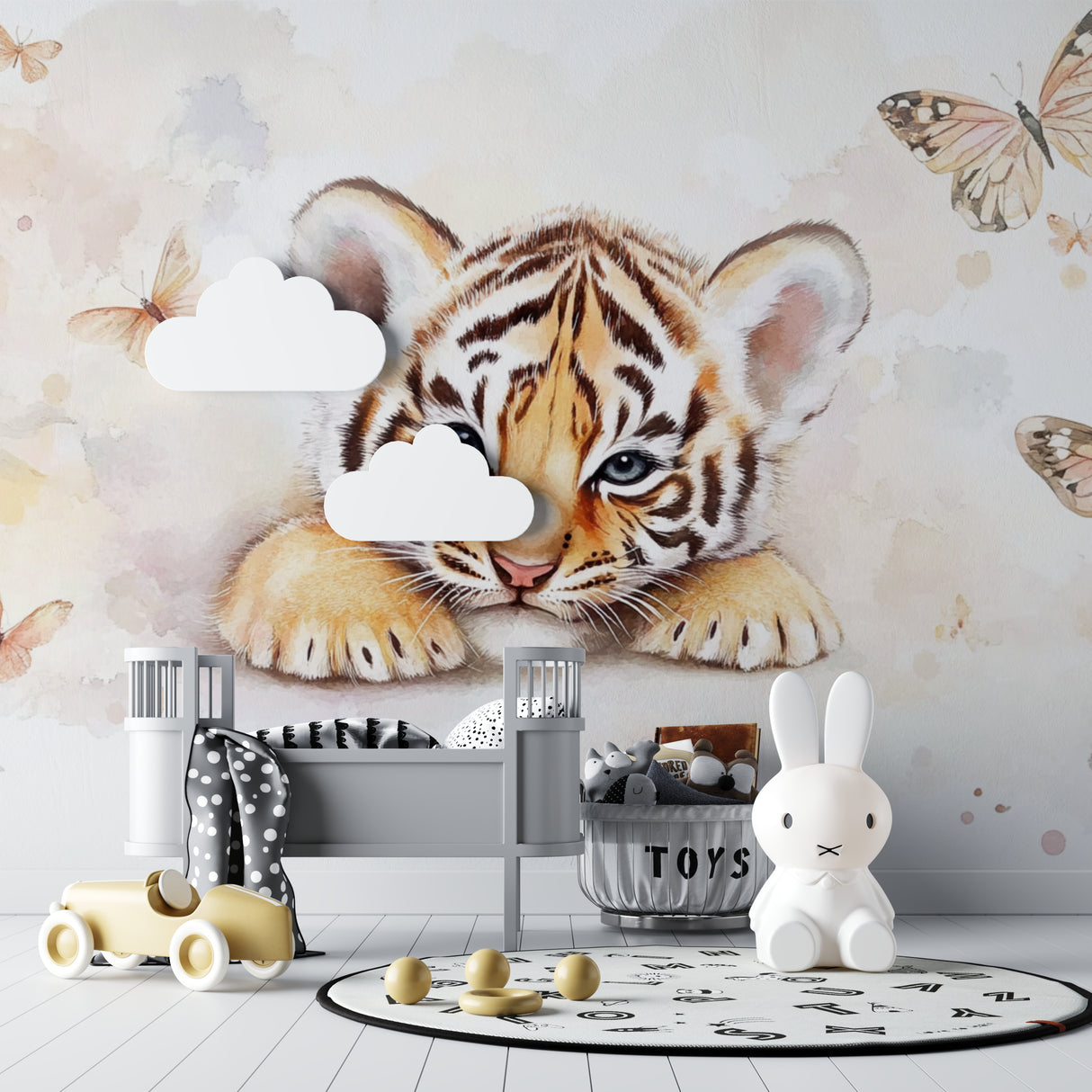 Papier Peint Mural Tigre | Design Bébé Lionceau avec Papillons