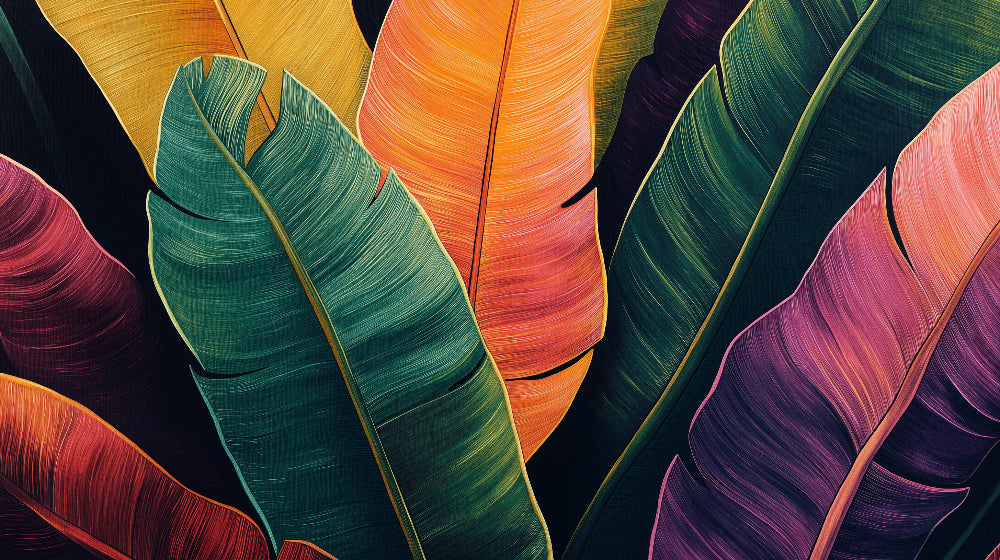 Papier Peint Mural Feuilles Tropicales | Art Vibrant de Feuilles de Banane sur Fond Noir