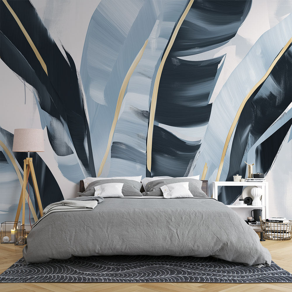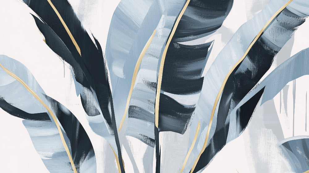 Ce papier peint à feuilles tropicales présente un jeu sophistiqué de formes botaniques surdimensionnées rendues en tons bleu marine profond et bleu poudre doux. La technique artistique du coup de pinceau crée une interprétation contemporaine du papier peint à feuilles de palmier, où chaque fronde semble danser sur le fond blanc. De délicates lignes dorées tracent les courbes des feuilles, ajoutant un élément de luxe et de chaleur à la composition graphique audacieuse.