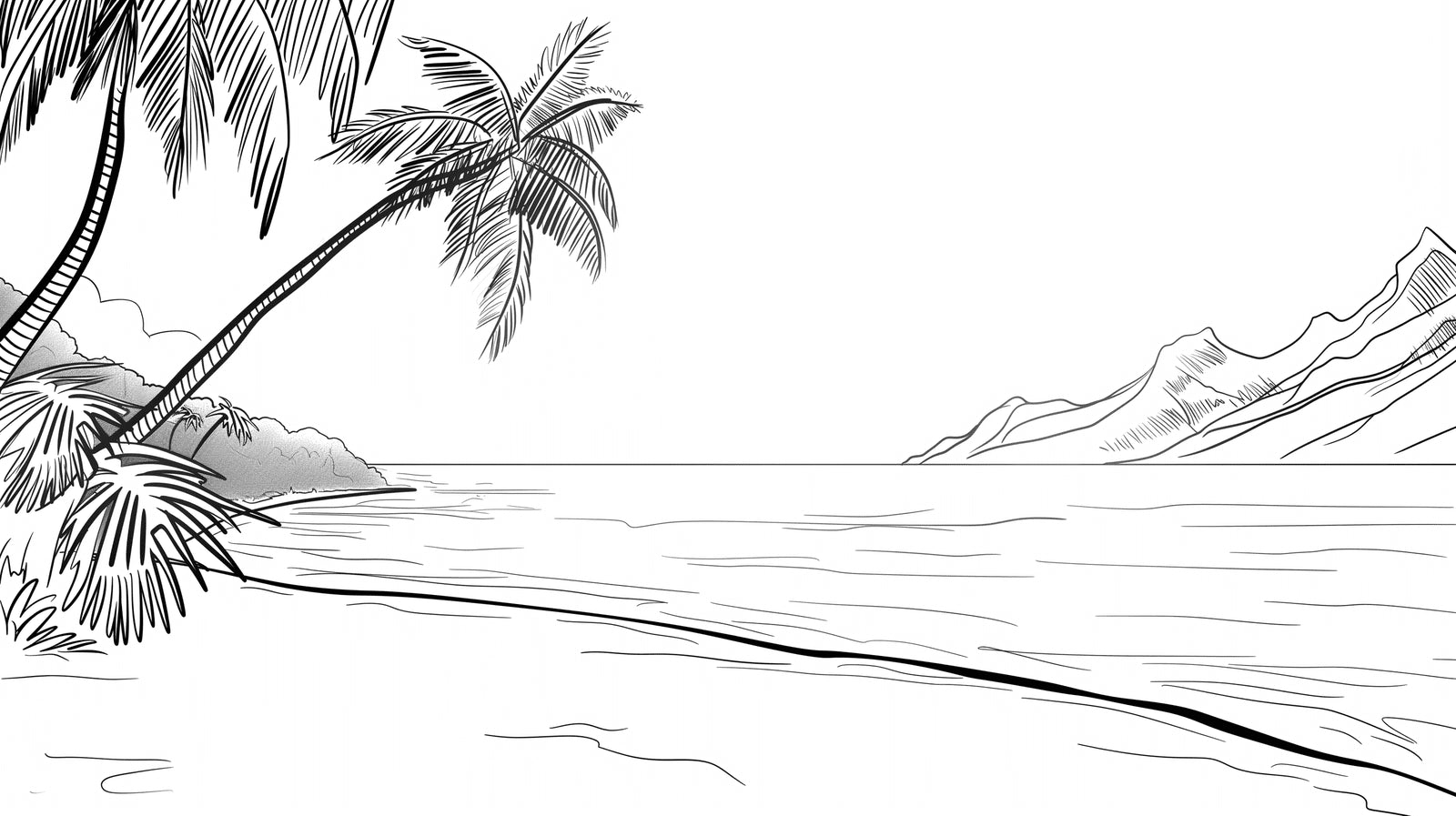 Ce papier peint plage tropicale présente une composition élégante en art linéaire où de gracieux palmiers se balancent contre un paysage océanique serein. Le design minimaliste en noir et blanc met en scène des montagnes délicatement esquissées s'élevant à l'horizon, tandis qu'un papier peint paysage de plage crée de la profondeur grâce à un travail de ligne précis et un espace négatif réfléchi. Chaque élément, des feuilles de palmier détaillées aux ondulations douces de l'océan, est rendu avec une précision artistique.