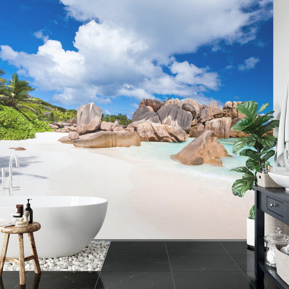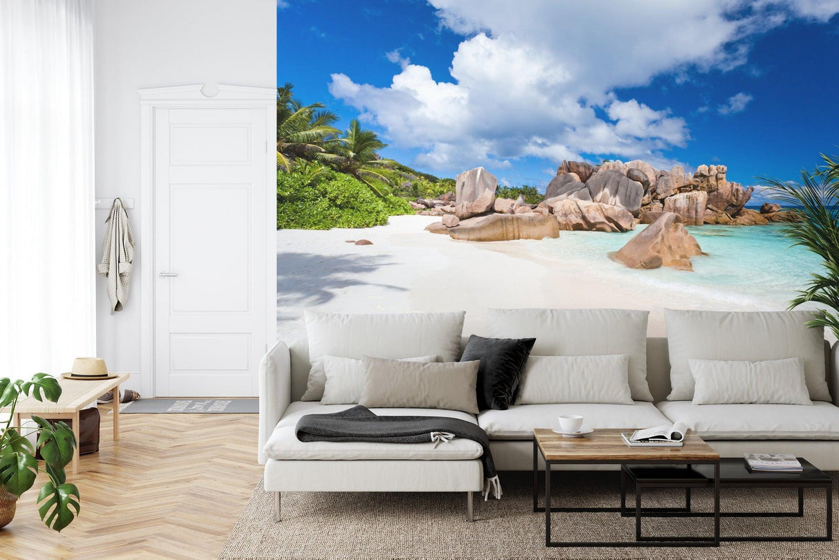 Ce papier peint plage tropicale capture la beauté brute de la nature où d'immenses formations granitiques rencontrent des eaux cristallines. La présence imposante des rochers lisses et sculptés crée un paysage côtier dramatique, leurs tons chauds beige et gris contrastant magnifiquement avec le sable blanc immaculé. Des feuilles de palmier luxuriantes et un feuillage verdoyant encadrent cette fresque murale plage paradisiaque, tandis que des nuages blancs flottants traversent un ciel azur intense.