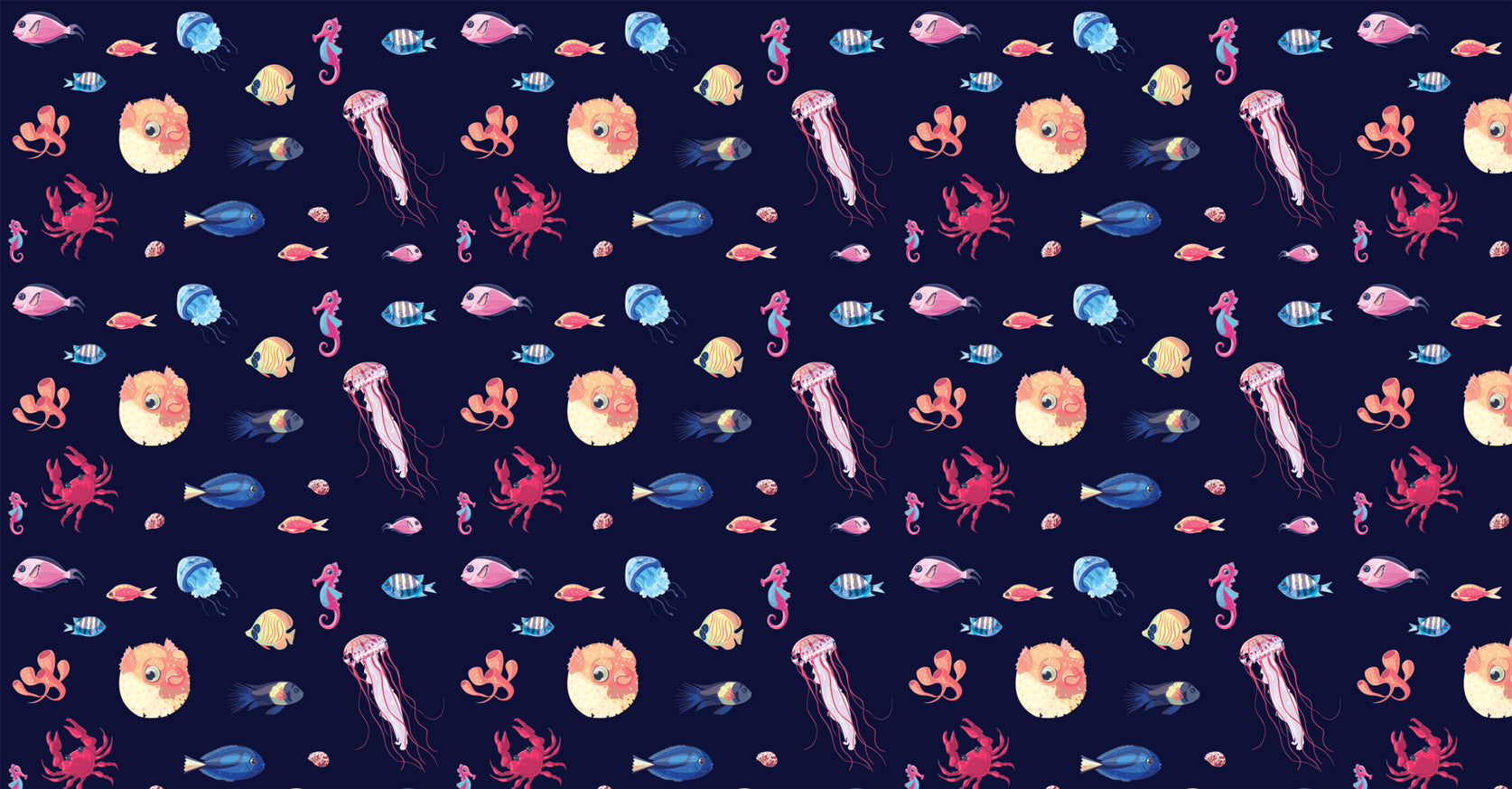 Ce papier peint vie marine enchanteur crée une scène sous-marine fantaisiste sur un fond bleu marine profond. De délicates méduses roses flottent gracieusement aux côtés d'hippocampes vibrants, tandis que des poissons-globes joueurs et des crabes rouges ajoutent du caractère à cette composition marine. La palette soigneusement sélectionnée présente des roses corail doux, des bleus océaniques et des jaunes dorés, chaque élément de papier peint sous-marin étant dessiné à la main pour capturer le charme des créatures marines en mouvement.
