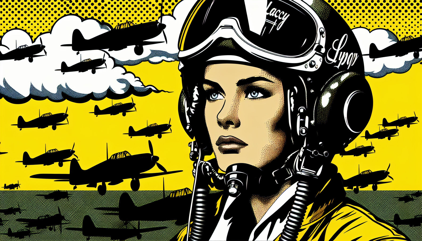 Questo dinamico murale da parete di aviazione cattura l'età d'oro del volo attraverso un'estetica pop art sorprendente. Ambientato su uno sfondo giallo vibrante punteggiato da motivi a mezzitoni in stile retrò, la composizione drammatica presenta sagome di aeromobili vintage che volano attraverso nuvole stilizzate. Il ritratto centrale, realizzato nello stile classico dei fumetti, combina linee nere audaci con sfumature sfumate, mentre l'equipaggiamento e gli occhiali del pilota mostrano dettagli meticolosi di arte fumettistica vintage.