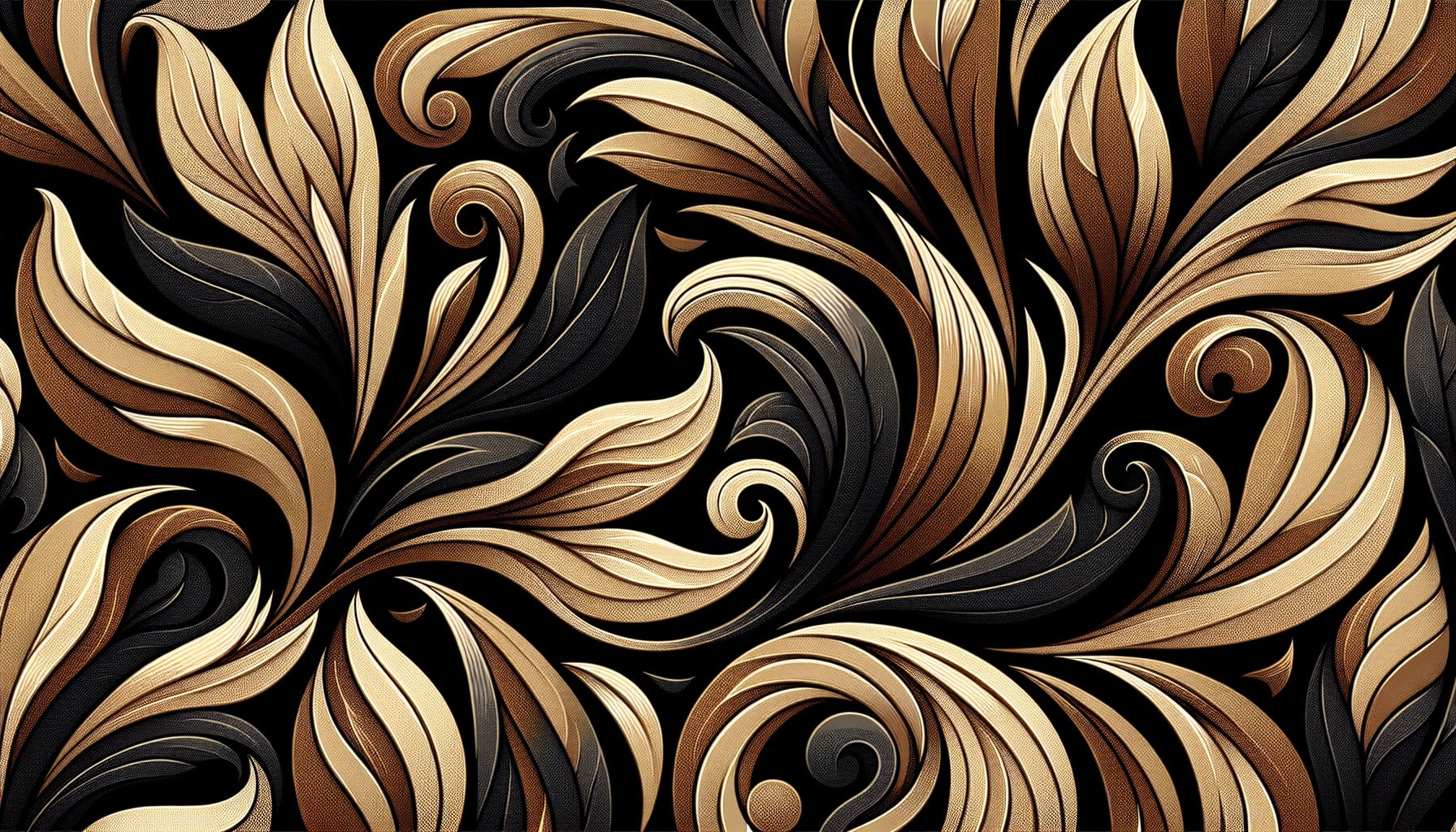 Questa carta da parati art deco presenta una danza ipnotica di forme a piuma vorticosa in ricchi toni di oro metallico, bronzo caldo e ebano profondo su uno sfondo nero drammatico. La carta da parati geometrica astratta fluente crea un motivo intricato di curve aggraziate e spirali eleganti, ogni elemento accuratamente realizzato con una qualità testurizzata e tridimensionale che aggiunge profondità e sofisticazione al design.