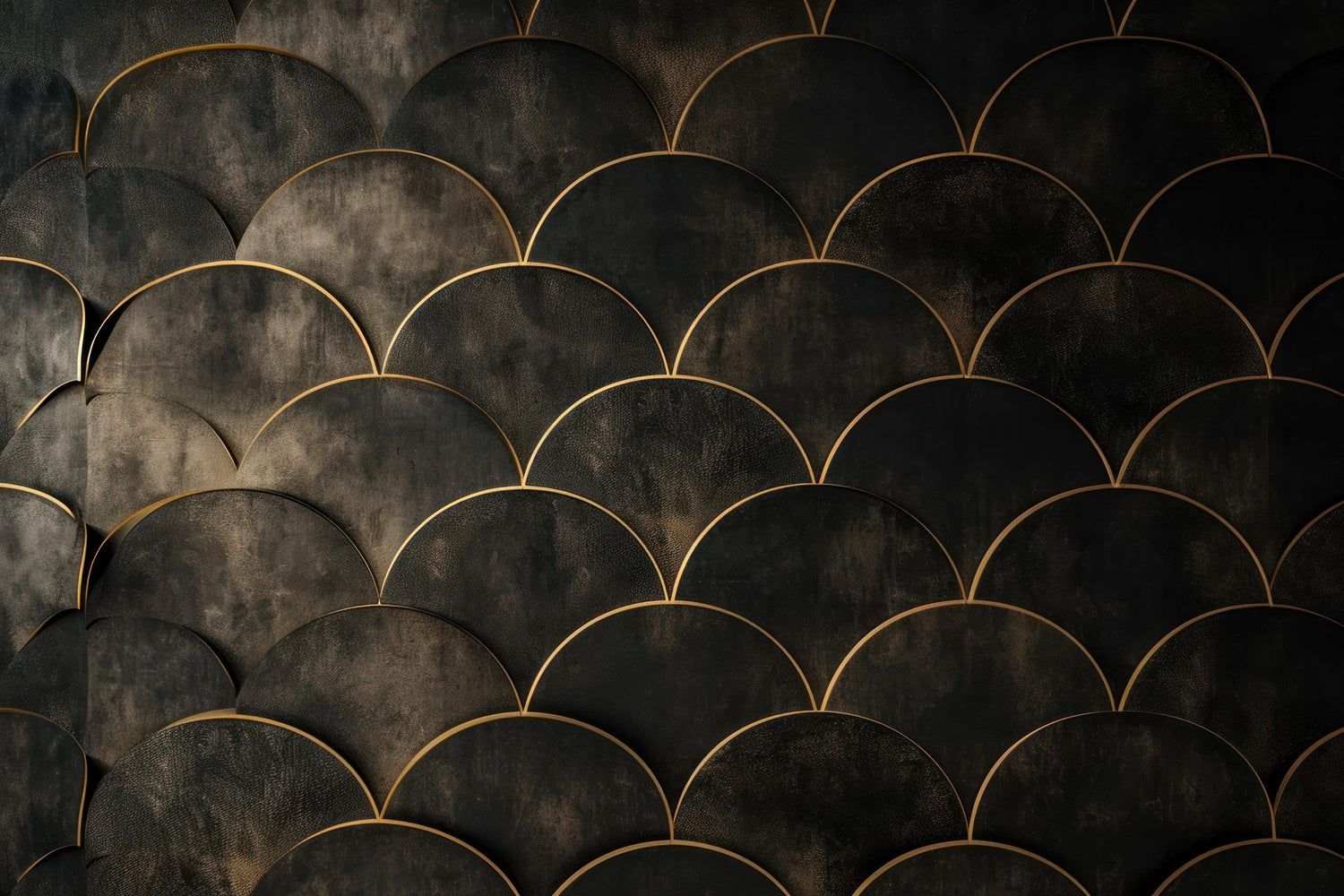 Questa carta da parati art deco presenta un magnifico motivo di scaglie sovrapposte in nero carbone profondo, delineate da archi dorati luminosi. Il sofisticato gioco tra lo sfondo scuro testurizzato e i dettagli in oro metallico crea un effetto ricco e tridimensionale che cattura l'essenza della carta da parati geometrica di lusso. Ogni scaglia possiede una sfumatura sottile, conferendo al design una qualità quasi tridimensionale che cambia con la luce.