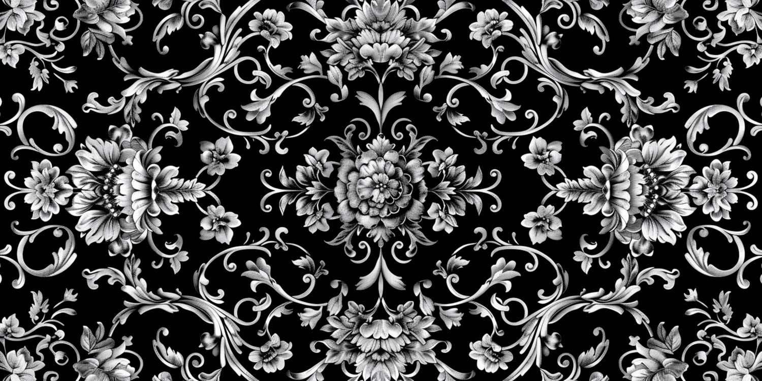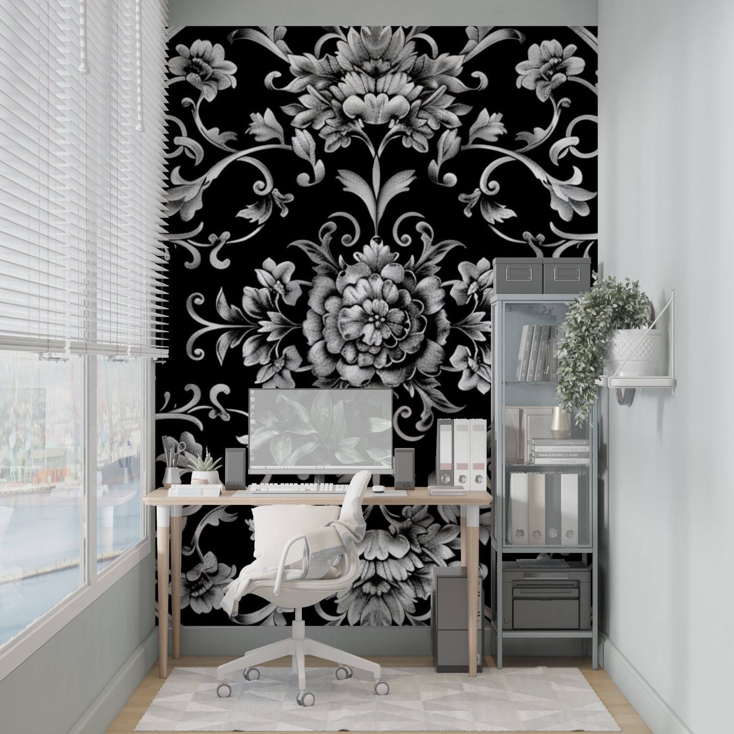 Carta da Parati Murale Barocca | Motivo Floreale Nero e Argento