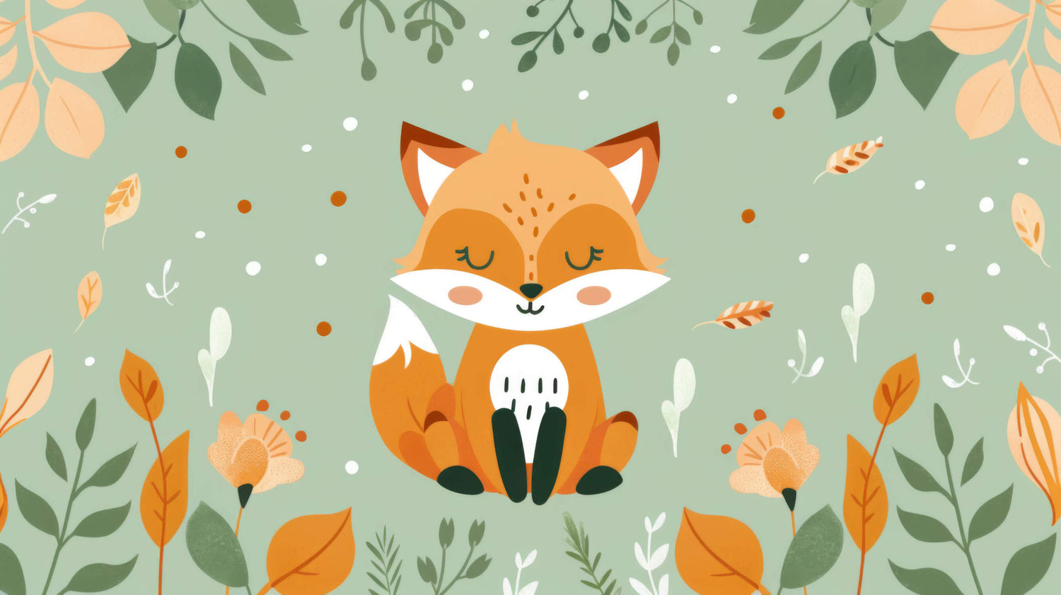 Questa incantevole carta da parati con volpe della foresta presenta una scena boschiva affascinante dove una dolce volpe è protagonista su uno sfondo verde salvia rilassante. Delicate foglie autunnali ed elementi botanici incorniciano il adorabile design della carta da parati con animali del bosco, mentre puntini bianchi sparsi e accenti arancioni creano un'atmosfera magica di foresta. L'espressione serena della volpe e il suo morbido pelo arancione portano calore e carattere a questa composizione ispirata alla natura.