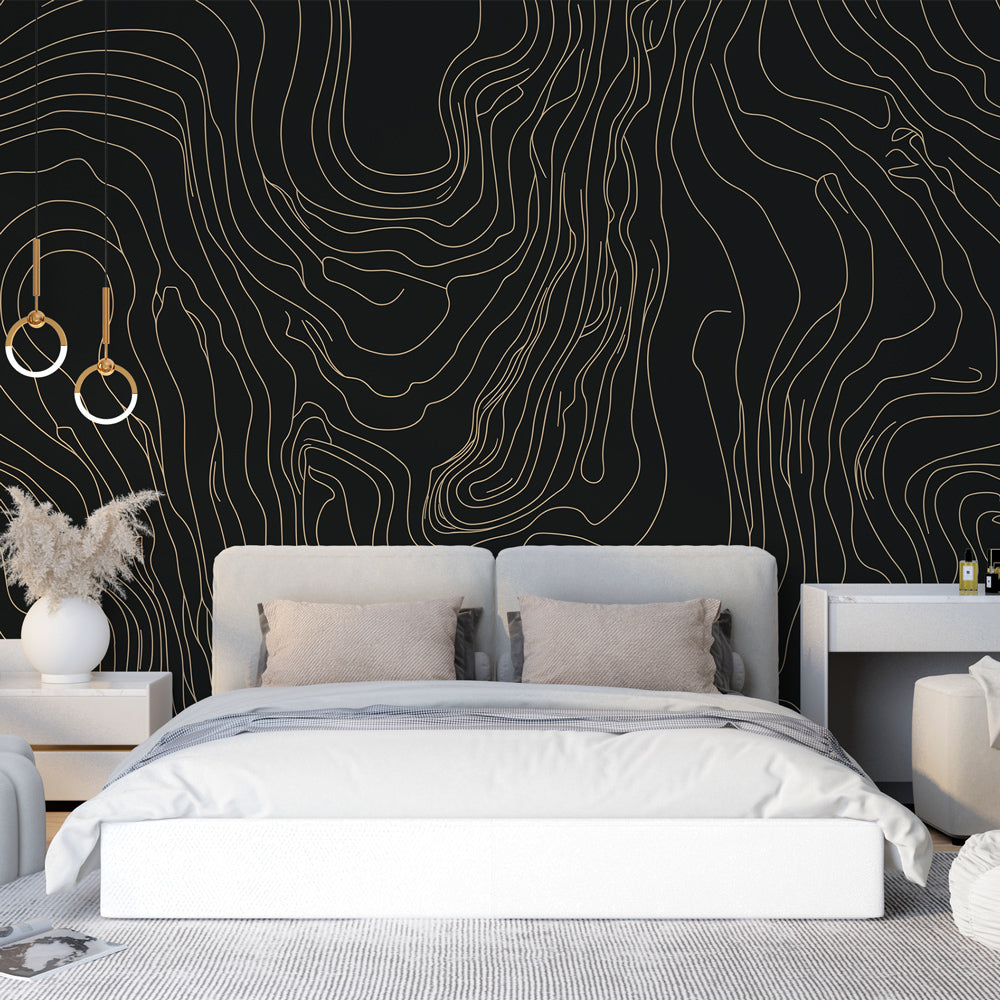 Questa carta da parati a linee astratte mostra un elegante gioco di linee dorate fluide su uno sfondo nero intenso. Il motivo sofisticato crea un design ipnotico ispirato alla topografia, dove delicati contorni metallici scorrono e si intrecciano sulla superficie. Ogni curva dorata è resa con precisione, creando una carta da parati geometrica moderna che bilancia il movimento organico con la precisione architettonica.