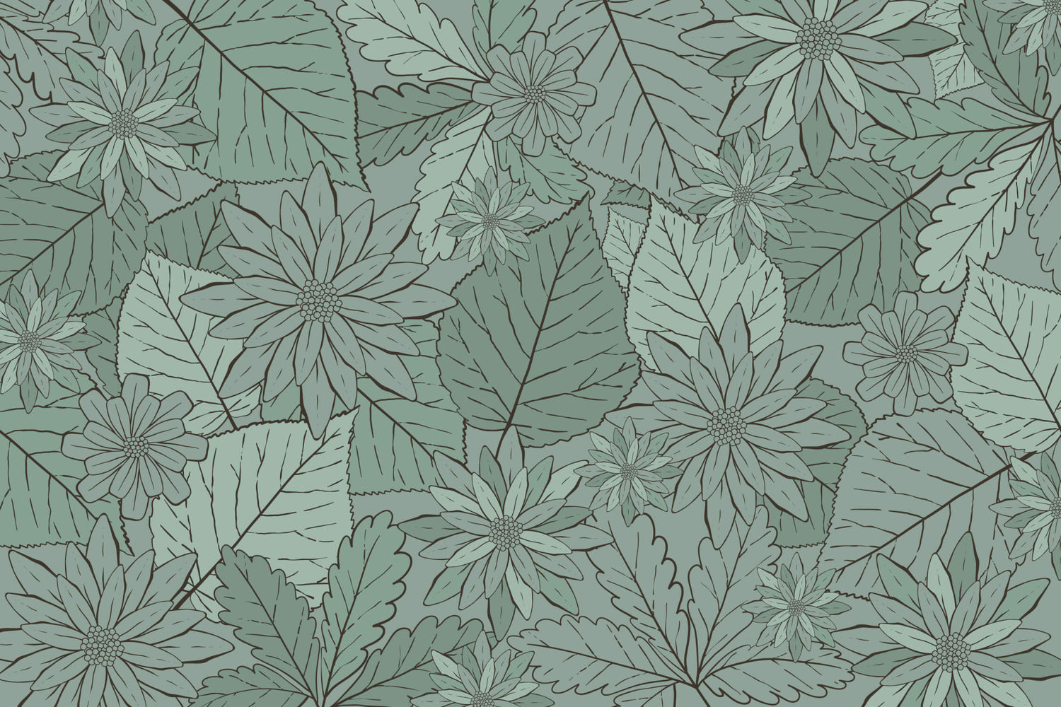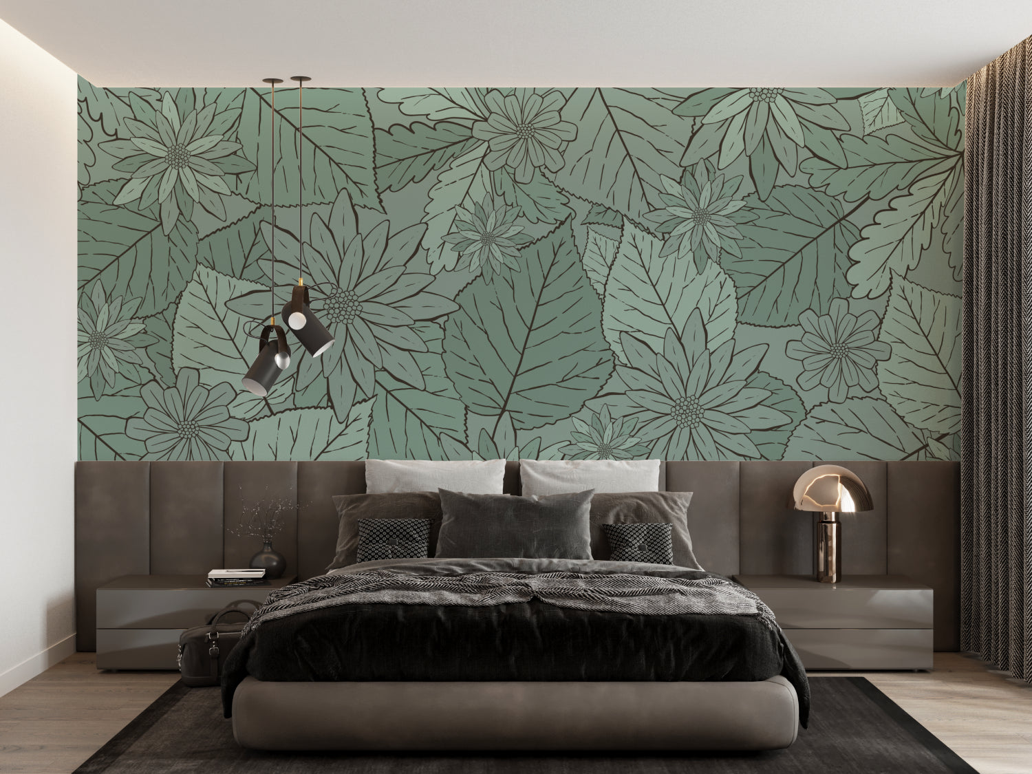 Questa carta da parati con disegni botanici a linee presenta una composizione elegante di grandi fiori simili a margherite e fogliame grazioso, realizzati in sofisticate tonalità di verde salvia. Il delicato lavoro a linee crea un motivo ipnotico in cui i petali dettagliati di ogni fiore e le foglie circostanti formano un disegno intricato e continuo. La carta da parati floreale a linee raggiunge un perfetto equilibrio tra sofisticazione artistica e ispirazione naturale.