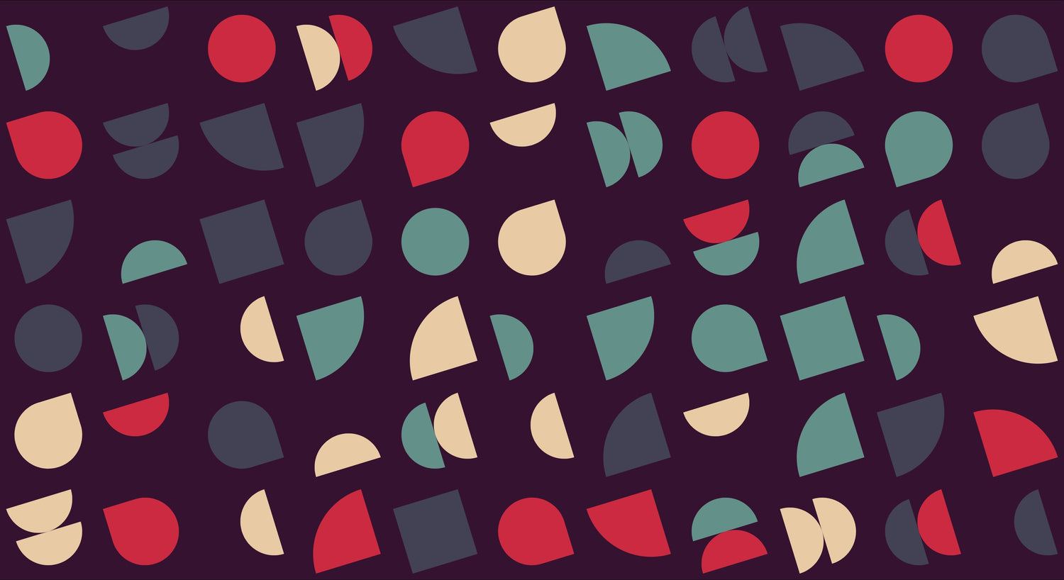 Questa carta da parati con motivo geometrico presenta un sofisticato gioco di forme e colori su uno sfondo viola intenso. Cerchi, mezze lune e quadrati disposti artisticamente in rosso intenso, verde salvia, carbone e crema creano un ritmo dinamico sulla parete. La carta da parati geometrica moderna mostra una composizione attentamente bilanciata che trae ispirazione dall'estetica del design di metà secolo.