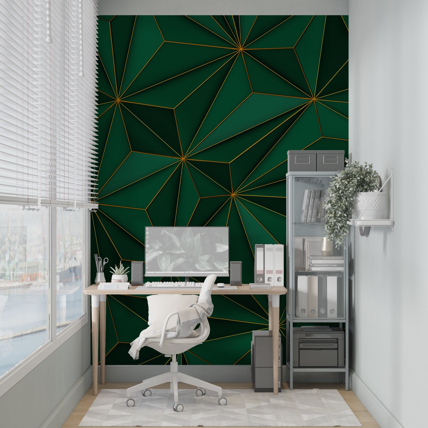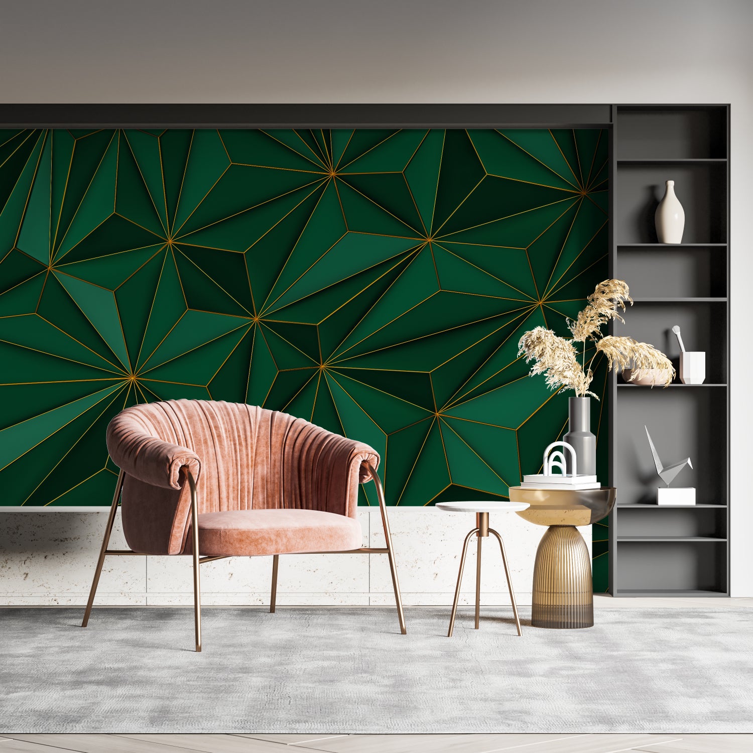 Trasforma qualsiasi spazio in un capolavoro architettonico con questo murale da parete verde moderno. Il design audace ma raffinato lo rende particolarmente adatto per uffici moderni, aree living o pareti di grande impatto dove il murale da parete geometrico può fungere da sfondo ispiratore. La sua composizione sofisticata dona profondità e carattere agli interni creando un'atmosfera di lusso discreto ed eleganza contemporanea.