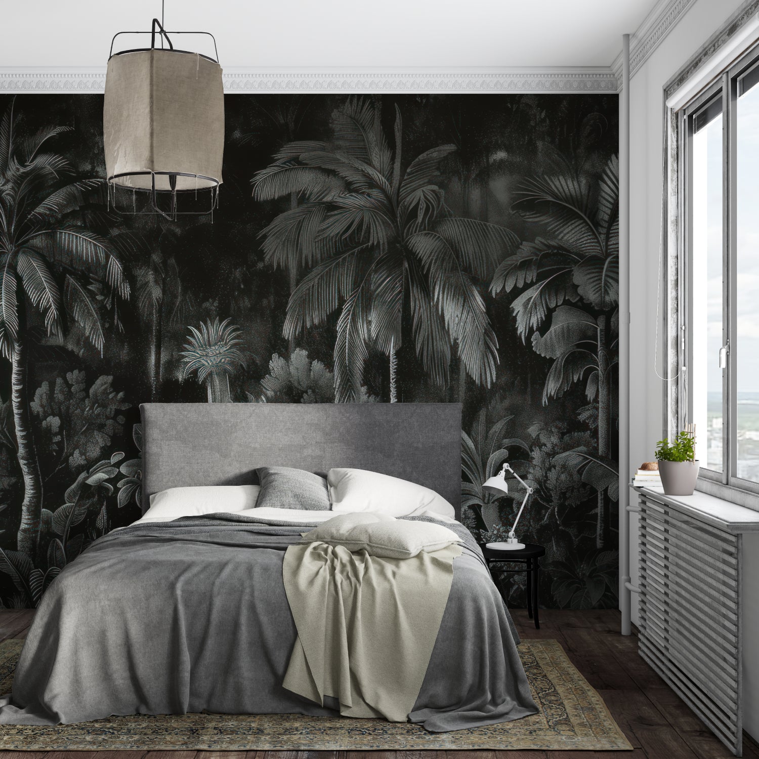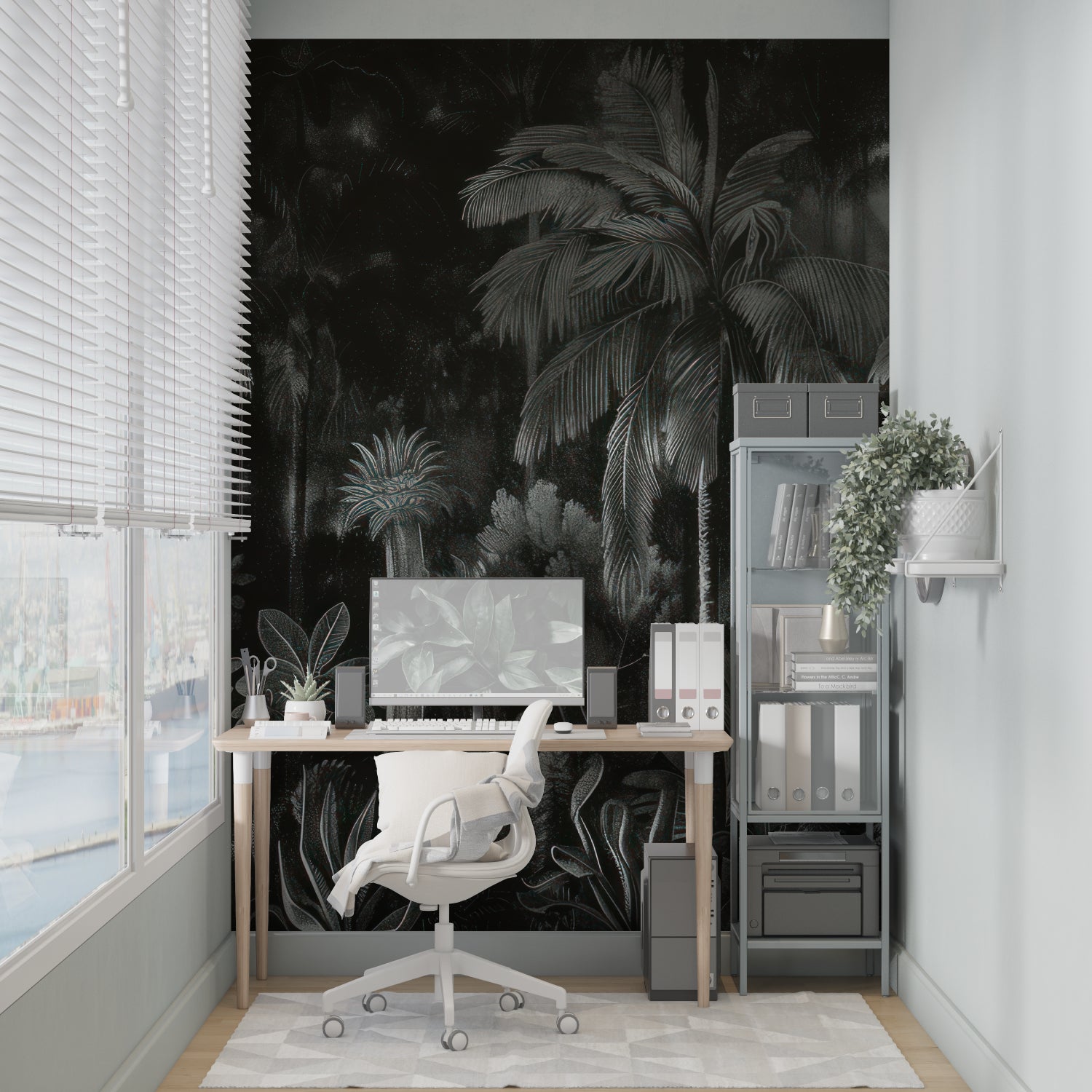 Le tonalità scure rendono questa carta da parati tropicale notturna perfetta per case moderne.
