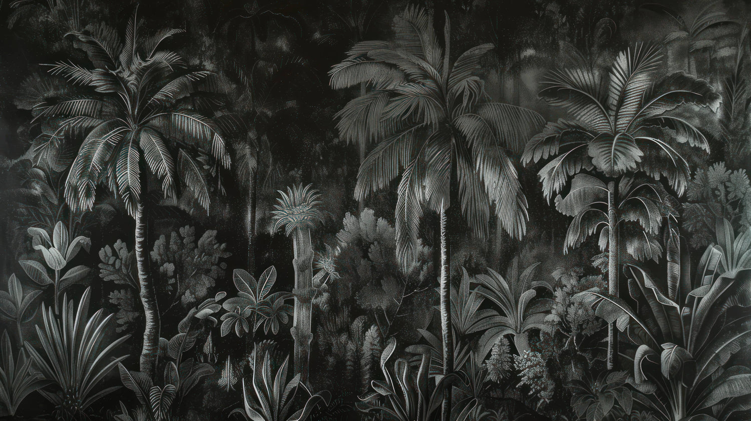 Questa carta da parati tropicale con palme presenta una scena notturna drammatica della giungla resa in sofisticate tonalità di carbone e ardesia. Maestose palme emergono dallo sfondo scuro con dettagli meticolosi, le loro fronde creano una intricata copertura contro il misterioso cielo scuro. La carta da parati nera della giungla offre un equilibrio magistrale di profondità e dimensione, dove ogni foglia e dettaglio della palma è accuratamente articolato.