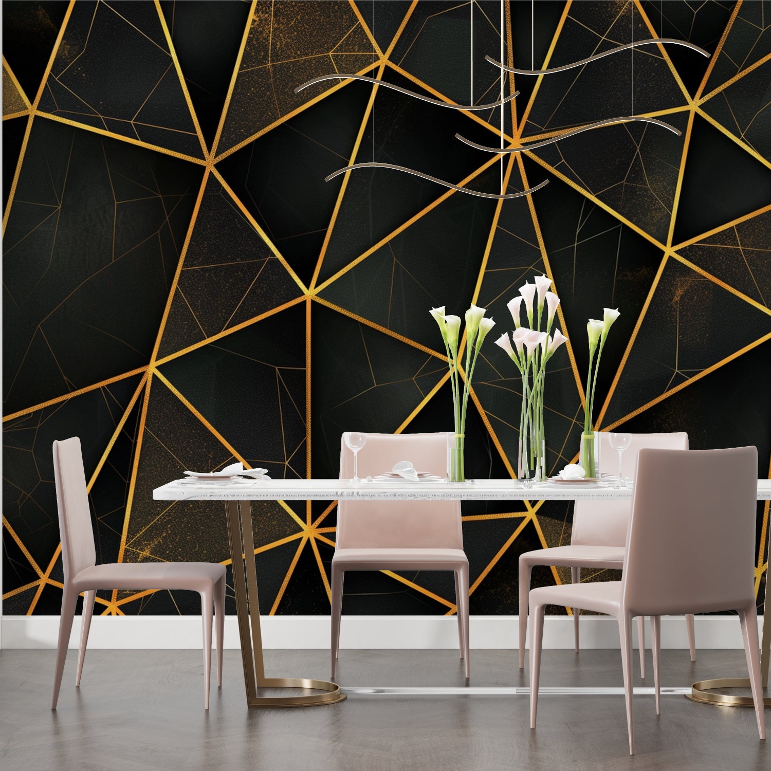 Questa carta da parati geometrica presenta un sofisticato gioco di linee angolari nette in lussuoso oro su uno sfondo nero profondo. I segmenti triangolari audaci creano un moderno motivo geometrico ipnotico, mentre sottili variazioni testurali e accenti metallici aggiungono profondità e dimensione. Ogni linea dorata si interseca con precisione per formare una composizione architettonica che cattura la luce e attira lo sguardo sulla sua superficie dinamica.