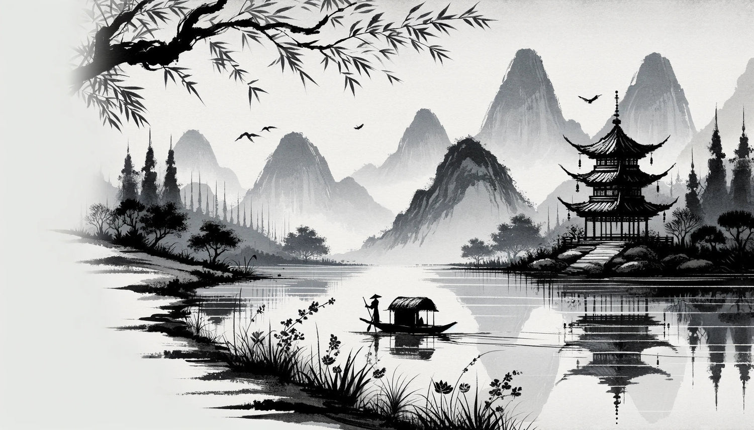 Questa carta da parati paesaggio giapponese cattura l'essenza della pittura tradizionale a inchiostro con le sue eteree cime montuose che emergono attraverso la nebbia. La composizione monocromatica presenta delicati rami di bambù, una pagoda tradizionale e uccelli in volo su uno sfondo di maestose montagne. La carta da parati zen bilancia artisticamente lo spazio negativo con dettagli intricati, creando un senso di profondità e tranquillità attraverso una magistrale pennellata e sfumature sottili.
