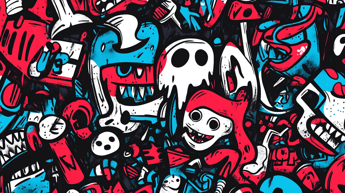 Questa dinamica carta da parati graffiti street art presenta una fusione audace di espressione urbana e design contemporaneo. Caratterizzata da una composizione energica di personaggi stilizzati in blu, rosso e bianco, questa carta da parati arte urbana crea un impatto visivo potente con i suoi elementi ispirati ai graffiti. I dettagli intricati e i motivi fluidi si fondono perfettamente su uno sfondo nero profondo, formando una mostra affascinante della cultura di strada moderna.