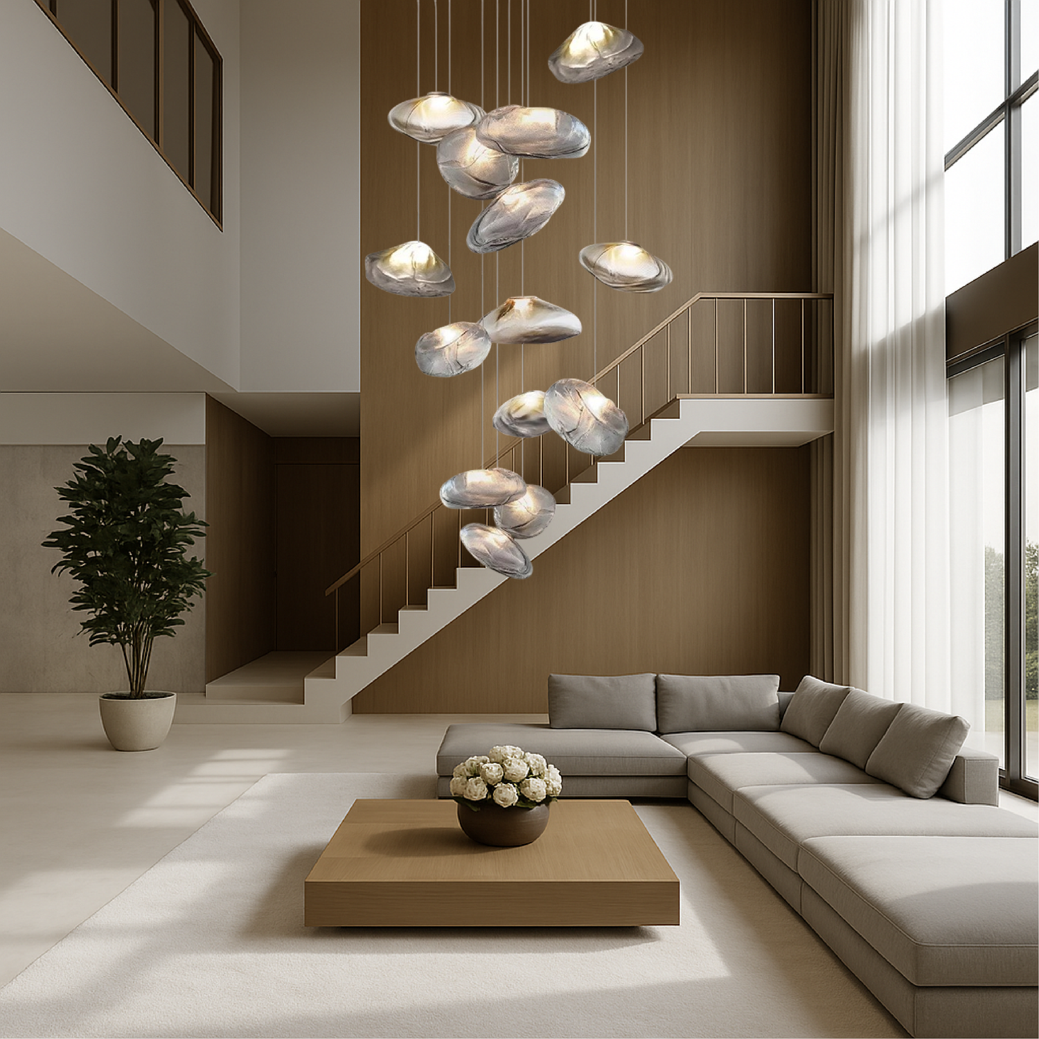 Contemporary ceiling lighting meets artistic expression in this sculptural glass pendant chandelier. Perfect for brightening up your dining area, living room or foyer with a mix of Nordic elegance and modern design. The graceful hanging shape and refined craftsmanship create a focal point that adds warmth and tranquility to any interior.