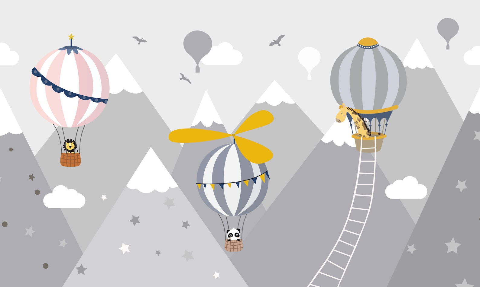 Questa incantevole carta da parati con mongolfiere crea una scena di avventura fiabesca contro uno sfondo montano sereno. Soffici mongolfiere rosa e grigie fluttuano graziosamente nel cielo nuvoloso, mentre un affascinante panda viaggia in un cestino festoso. Il design presenta dettagli delicati tra cui uccelli in volo, stelle sparse e forme geometriche di montagne in toni grigi calmanti, creando un murale da parete per la cameretta che cattura lo spirito dell'esplorazione infantile.