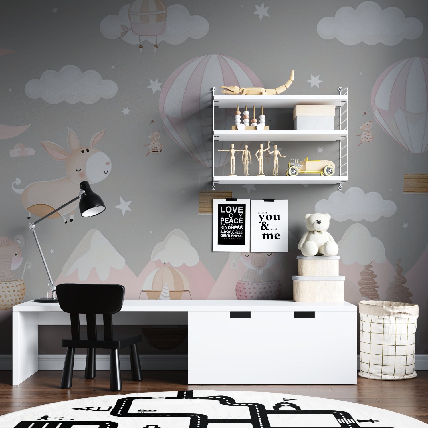 Trasforma qualsiasi spazio in un magico paese delle meraviglie con questa carta da parati per bambini con palloncini. La palette di colori rilassante di grigio, bianco e rosa cipria crea un ambiente calmante ideale per camerette, sale giochi o camere da letto. Questa carta da parati con nuvole e stelle fornisce lo sfondo perfetto sia per il riposo che per il gioco immaginativo, mantenendo un'estetica contemporanea che cresce con il tuo bambino.