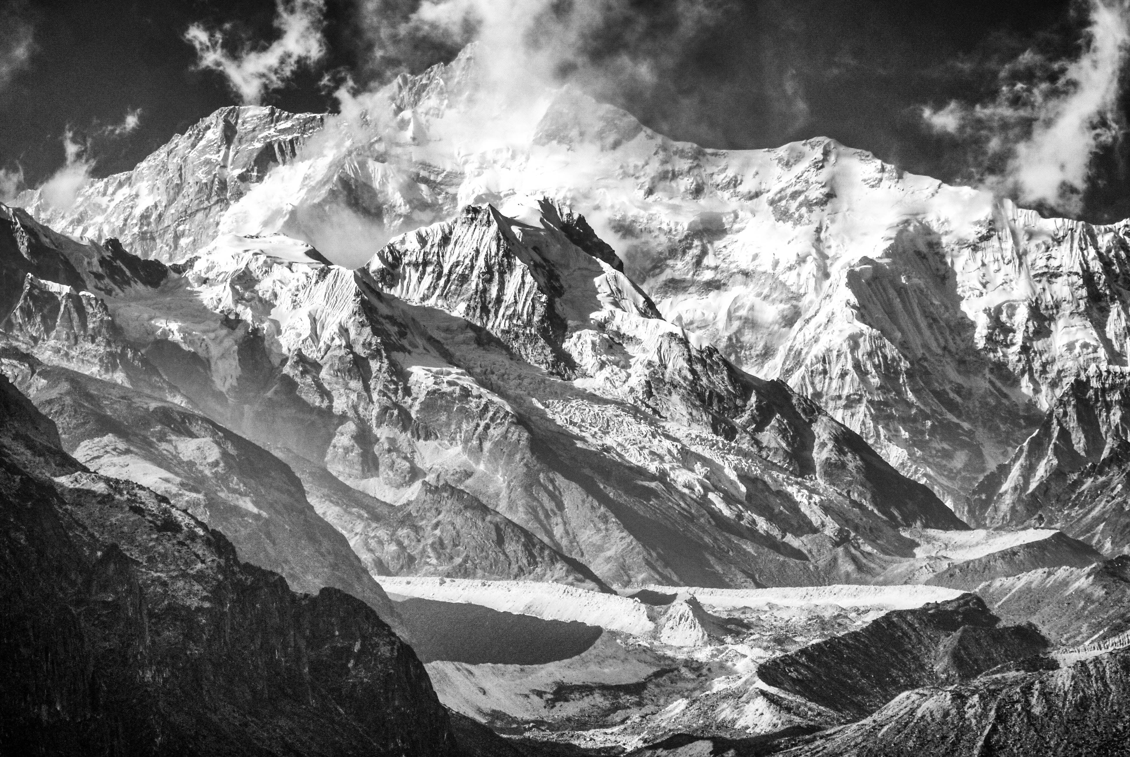 Questa carta da parati paesaggio montano cattura la maestosità pura delle cime innevate in una fotografia in bianco e nero sorprendente. Il contrasto drammatico tra luce e ombra rivela le trame intricate di scogliere aspre, formazioni glaciali e campi di neve incontaminati. Soffi di nuvole danzano intorno alla carta da parati cime alpine, creando un senso di scala e atmosfera che dà vita a questa vista montuosa.