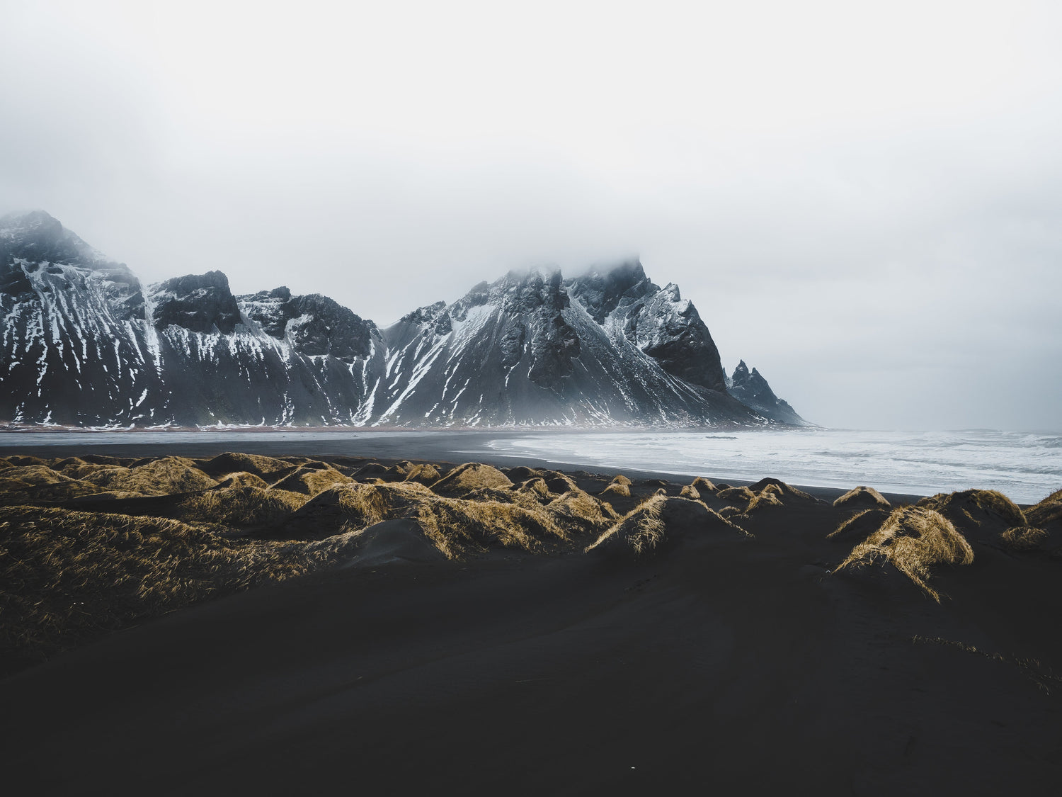 Questa carta da parati paesaggio montano cattura la maestosità cruda delle cime innevate che si ergono contro un cielo grigio cupo. Il contrasto drammatico tra le dune di sabbia vulcanica scura in primo piano e la carta da parati catena montuosa striata di ghiaccio crea una profondità di campo avvincente. L'atmosfera nebbiosa e il terreno accidentato mostrano la bellezza selvaggia della natura in toni netti di nero, bianco e terra.