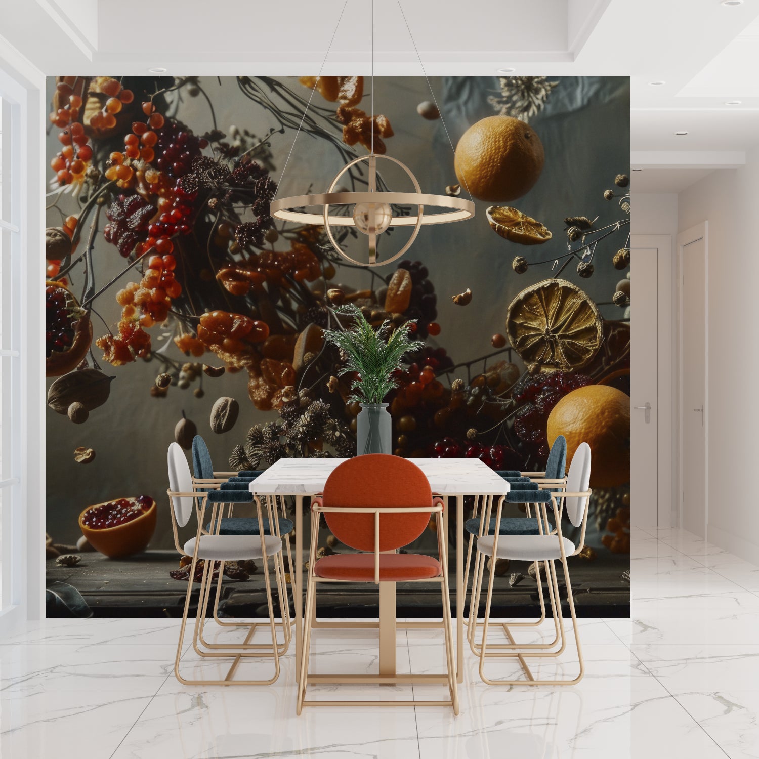 Questa carta da parati murale botanica cattura una composizione natura morta ipnotica dove bacche rosse vibranti e frutti agrumati dorati sembrano fluttuare in un'atmosfera onirica. Ambientata su uno sfondo grigio sofisticato, il design della carta da parati con frutta crea una mostra incantevole di forme organiche, con fiori secchi e rami delicati che si intrecciano in tutta la composizione, offrendo un'interpretazione artistica dell'abbondanza naturale.
