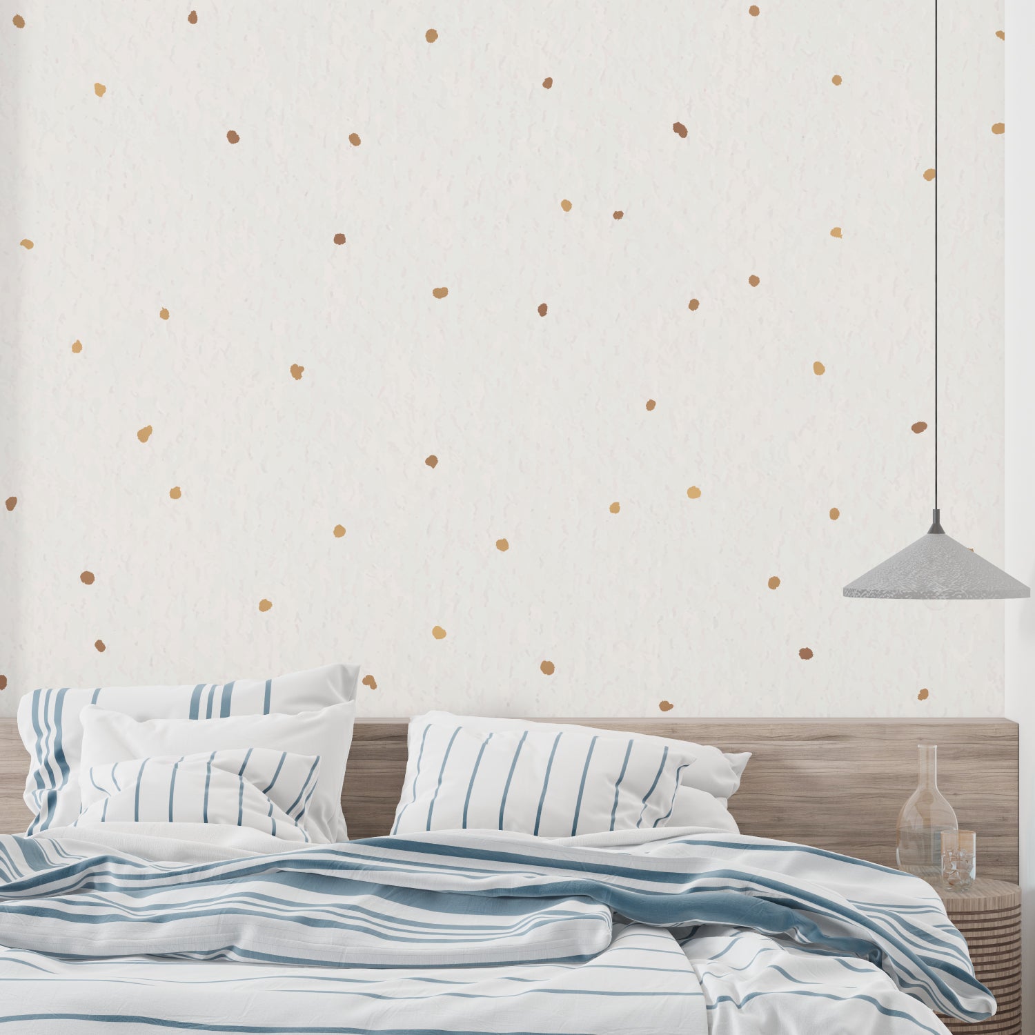 Trasforma il tuo spazio con questa carta da parati moderna a pois che si adatta senza sforzo a vari stili d'interni. La carta da parati con motivo dorato crea un'atmosfera di lusso raffinato senza sopraffare i sensi, rendendola una scelta ideale per chi desidera aggiungere un tocco di eleganza ai propri spazi abitativi, camere da letto o uffici domestici. Gli accenti metallici catturano e riflettono la luce durante tutto il giorno, dando vita alle tue pareti con un movimento sottile e scintillio.