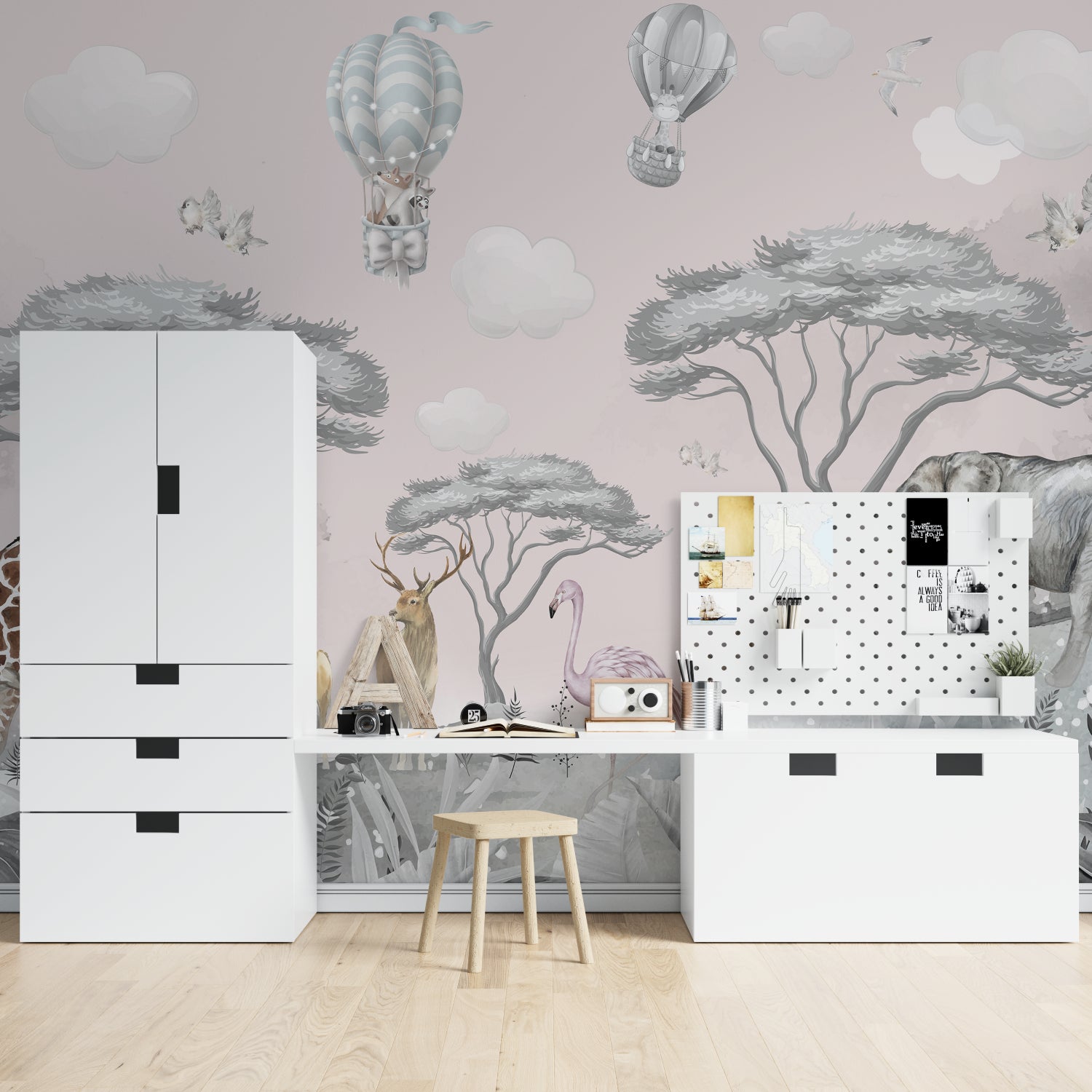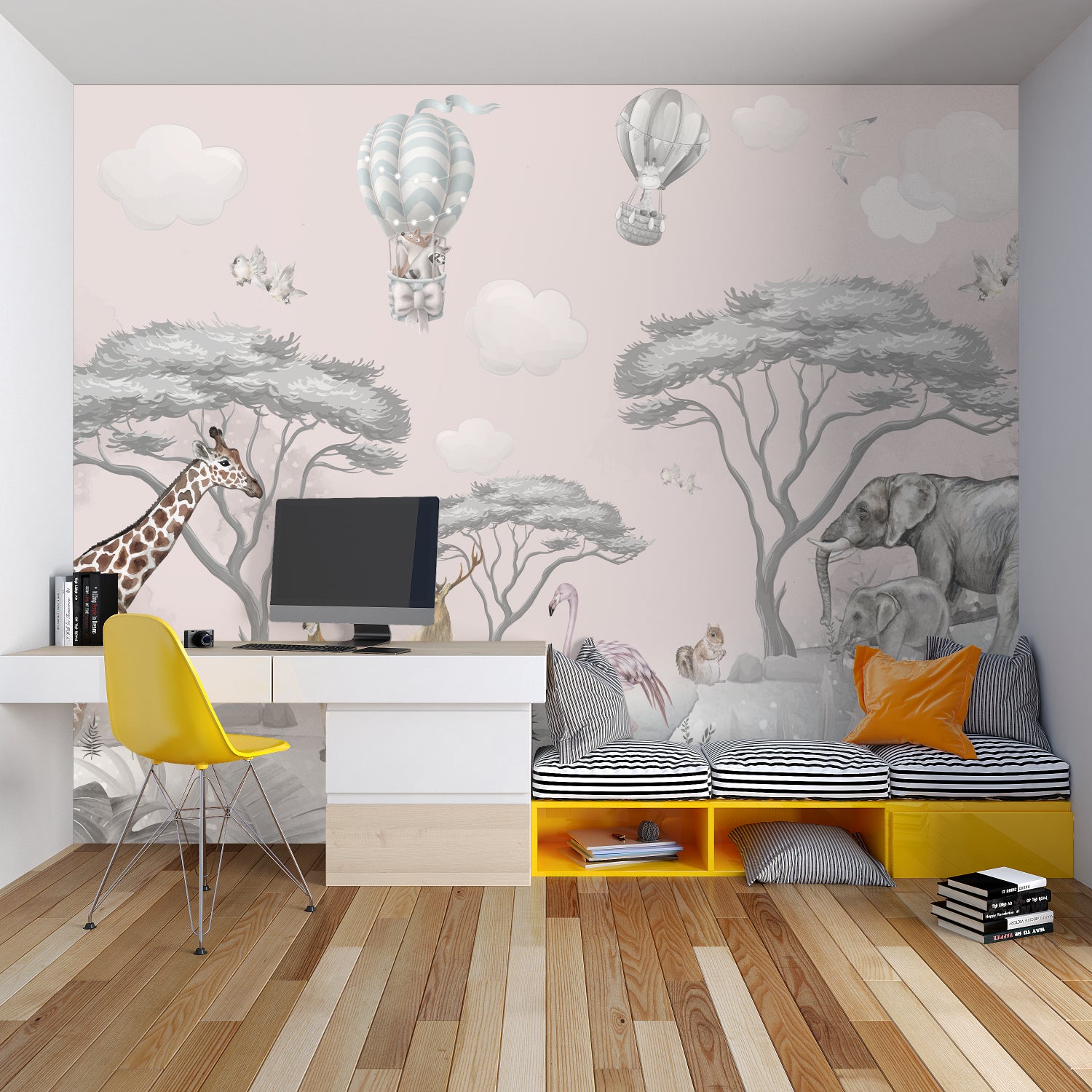 Carta da Parati Safari Kids Mural | Mongolfiere Pastello ed Elefanti