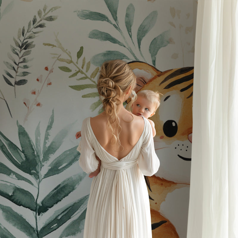 Questo affascinante murale carta da parati tigre unisce la fantasia dell'infanzia al sofisticato design scandinavo. Il pezzo centrale presenta un adorabile personaggio di tigre reso in calde tonalità dorate, ambientato su uno sfondo sereno di elementi di carta da parati botanica. Delicate foglie acquerellate in morbidi verdi salvia e tenui tonalità pesca creano un ambiente naturale rilassante, mantenendo un'estetica artistica e raffinata.