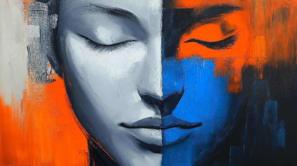 Deze opvallende abstracte portretbehang toont een meesterlijke wisselwerking van contrasterende elementen, waar zilverwit en levendig oranje samenkomen met elektrisch blauw in een dramatische compositie. De artistieke interpretatie vangt een serene uitdrukking, verdeeld tussen licht en schaduw, weergegeven in gedurfde penseelstreken die een krachtig visueel verhaal creëren. De moderne gezichtsmuur toont uitzonderlijke diepte door zijn getextureerde uiterlijk en verfijnde kleurblokkerings-techniek.