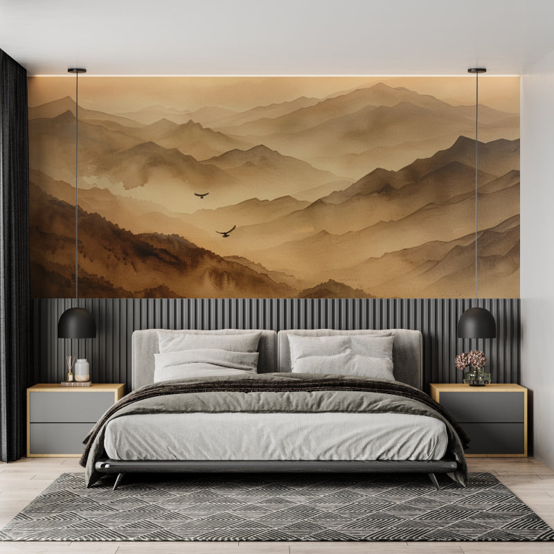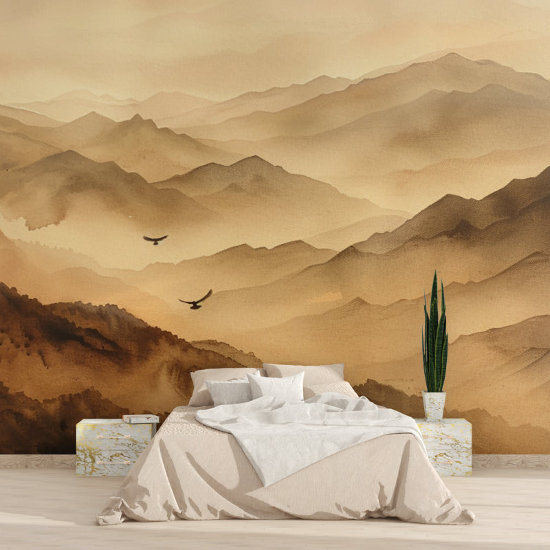 Deze berglandschap behang vangt de etherische schoonheid van mistige pieken die baden in warme terracotta tinten. De gelaagde bergen creëren een betoverend diepte-effect, terwijl zwevende vogels een dynamisch element toevoegen aan dit serene uitzicht. Elke bergkam vervaagt in de verte met subtiele verlopen, wat een panoramische bergmuur creëert die rust en natuurlijke grootsheid belichaamt.