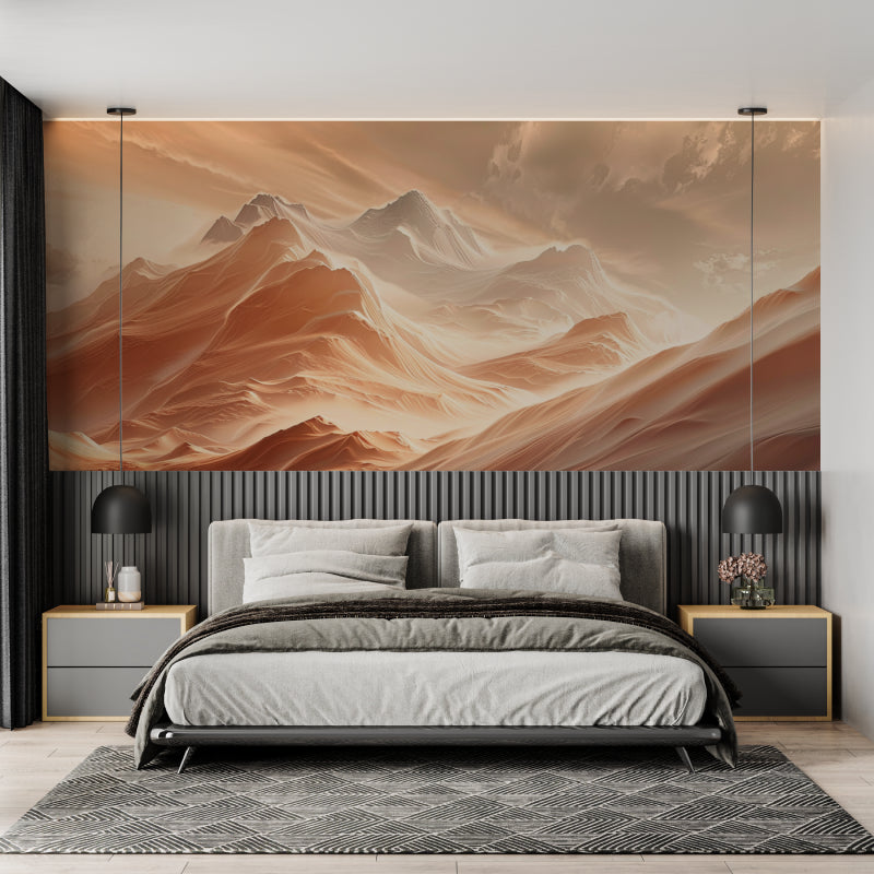 Deze bergketen behang vangt de majestueuze schoonheid van met sneeuw bedekte pieken die baden in warme terracotta tinten. Het dramatische landschap ontvouwt zich over je muur met zachte verlopen van zachte beige en koraaltinten, waardoor diepte en dimensie ontstaan. Elke piek en vallei is met uitzonderlijke details weergegeven, terwijl de zonsondergang bergmuur etherische wolken bevat die over het tafereel drijven, wat beweging en sfeer toevoegt aan deze opvallende compositie.