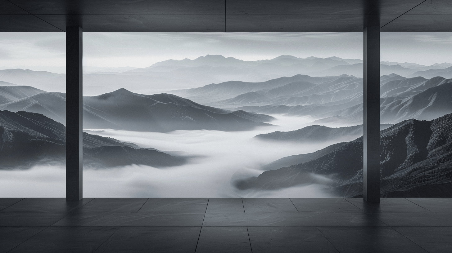 Deze panoramische bergbehang onthult een betoverend uitzicht waar lagen mistige pieken vervagen in de horizon. Het monochromatische palet creëert een verfijnde wisselwerking van licht en schaduw, met glooiende heuvels gehuld in etherische mist. Elke grijstint vangt het dramatische berglandschap behang in perfecte harmonie, en biedt een venster naar een serene natuurlijke wereld waar de tijd lijkt stil te staan.