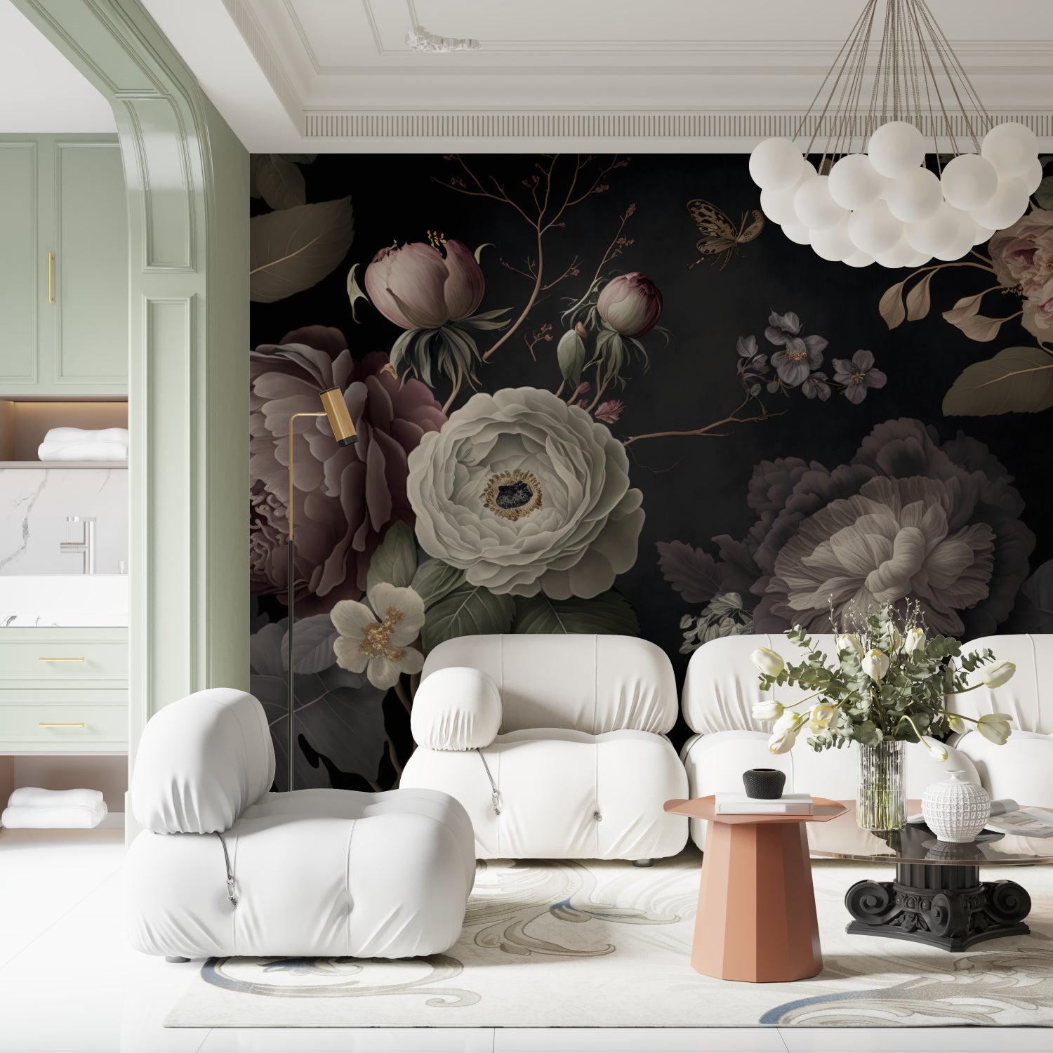 Deze donkere bloemenbehang toont een betoverende compositie van uitvergrote bloemen tegen een rijke zwarte achtergrond. De witte ranonkel in het midden trekt de aandacht met zijn delicate gelaagde bloemblaadjes, terwijl donkerroze pioenrozen en subtiele lila bloesems diepte en beweging creëren. Elke bloem is in prachtige details weergegeven, aangevuld met sierlijke gouden vlinders en delicate bladstelen die een vintage botanisch behang esthetiek tot leven brengen.
