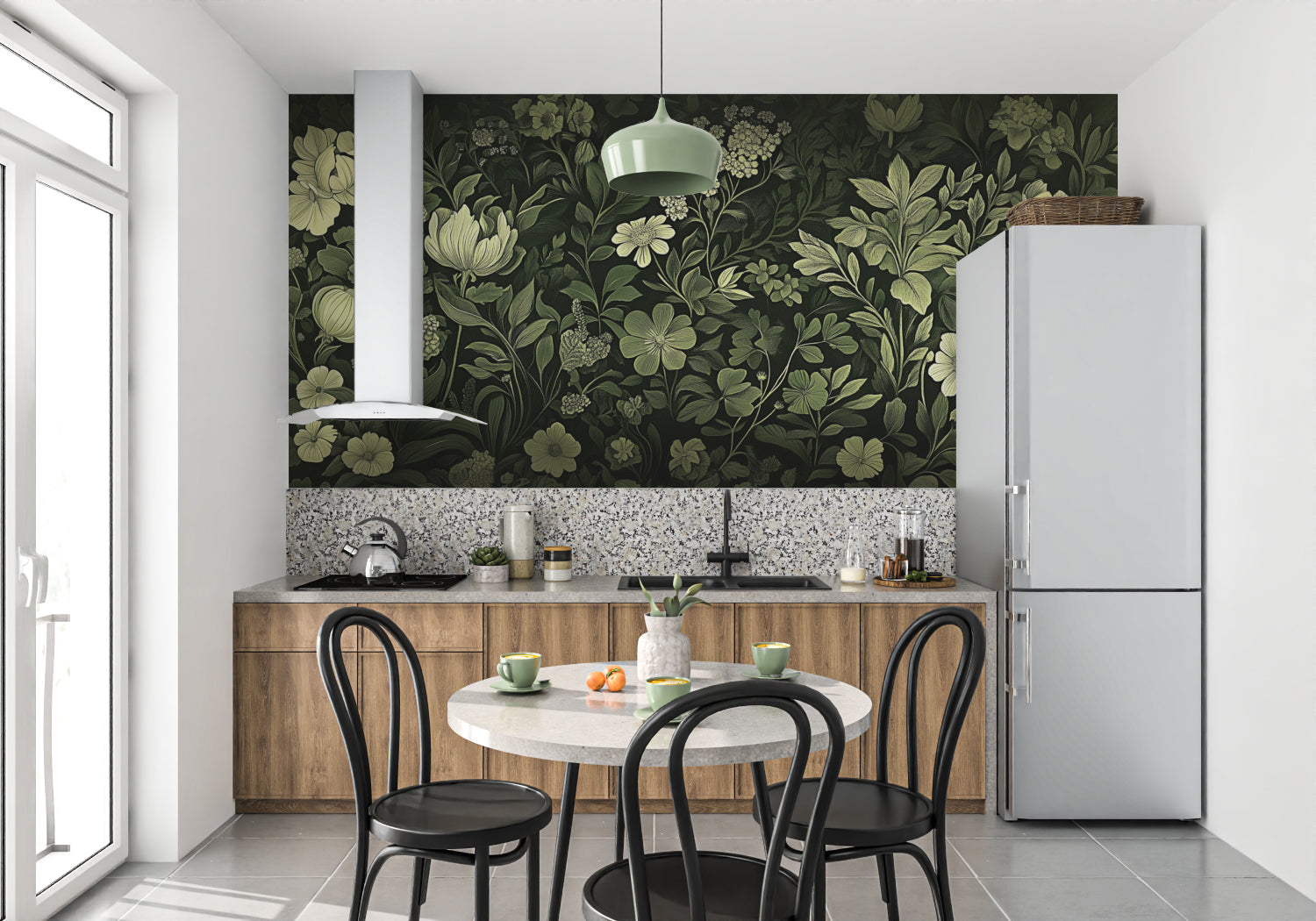 The dark green backdrop makes your floral feature wall pop with natural drama.
