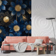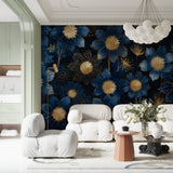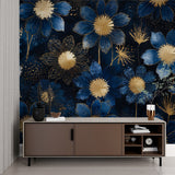 Deze art deco bloemenbehang toont een prachtige weergave van uitvergrote bloemen in diep marineblauw met glanzende gouden centra. De artistieke compositie bevat delicate goudomrande bloemblaadjes en speelse paardenbloemachtige uitbarstingen tegen een rijke middernachtelijke achtergrond, wat een betoverend blauw en goud behang creëert dat de essentie van luxe en verfijning vastlegt.