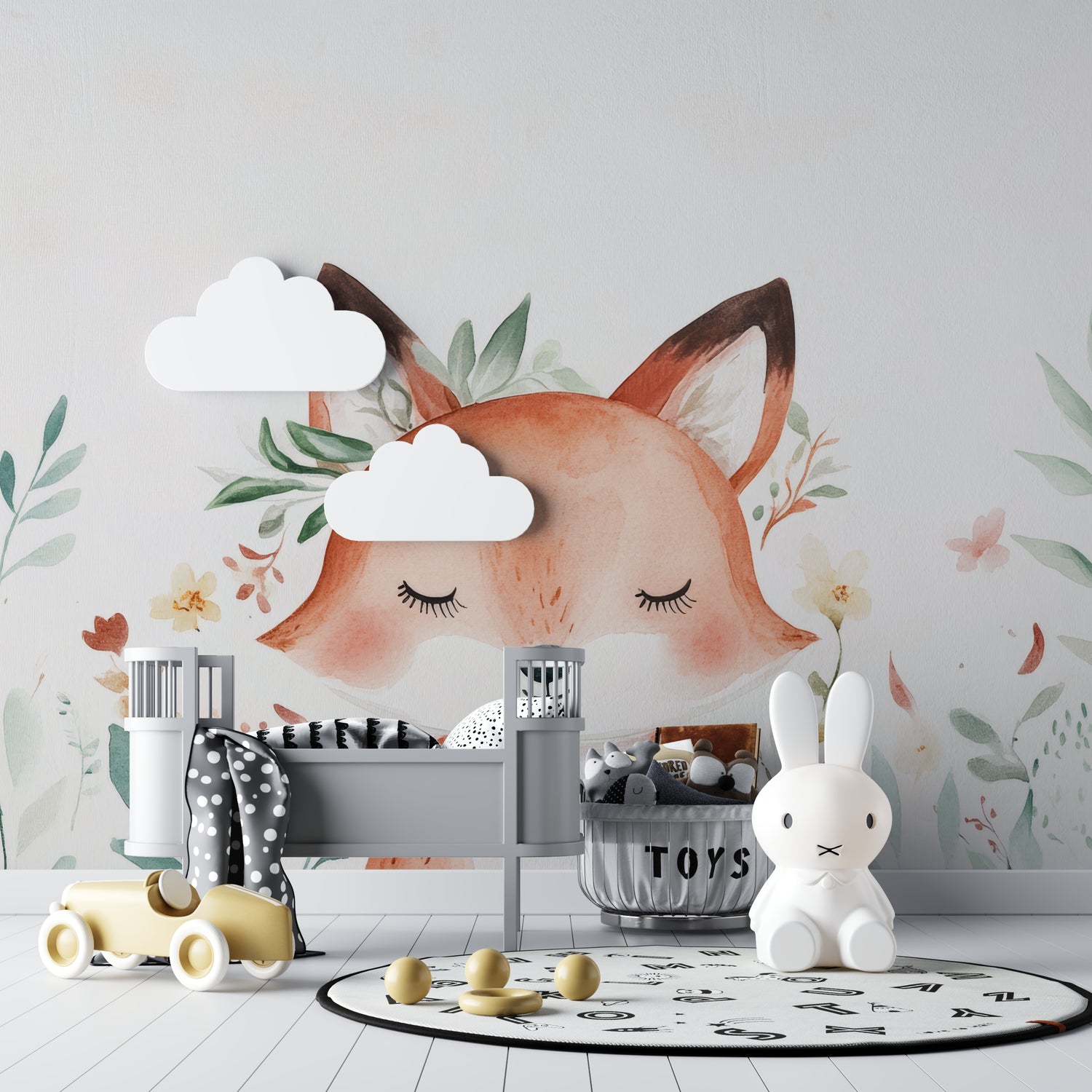 Deze betoverende vos behangmuur toont een zachte slapende vos versierd met delicate bloemmotieven en saliegroene bladeren. De aquarelstijl illustratie vangt de onschuld van het bosachtige charme met zijn zachte terracottatinten en onberispelijke witte achtergrond. Fijne botanische details en subtiele vlinders creëren een bosdieren behang dat sereniteit en natuurlijke gratie uitstraalt.