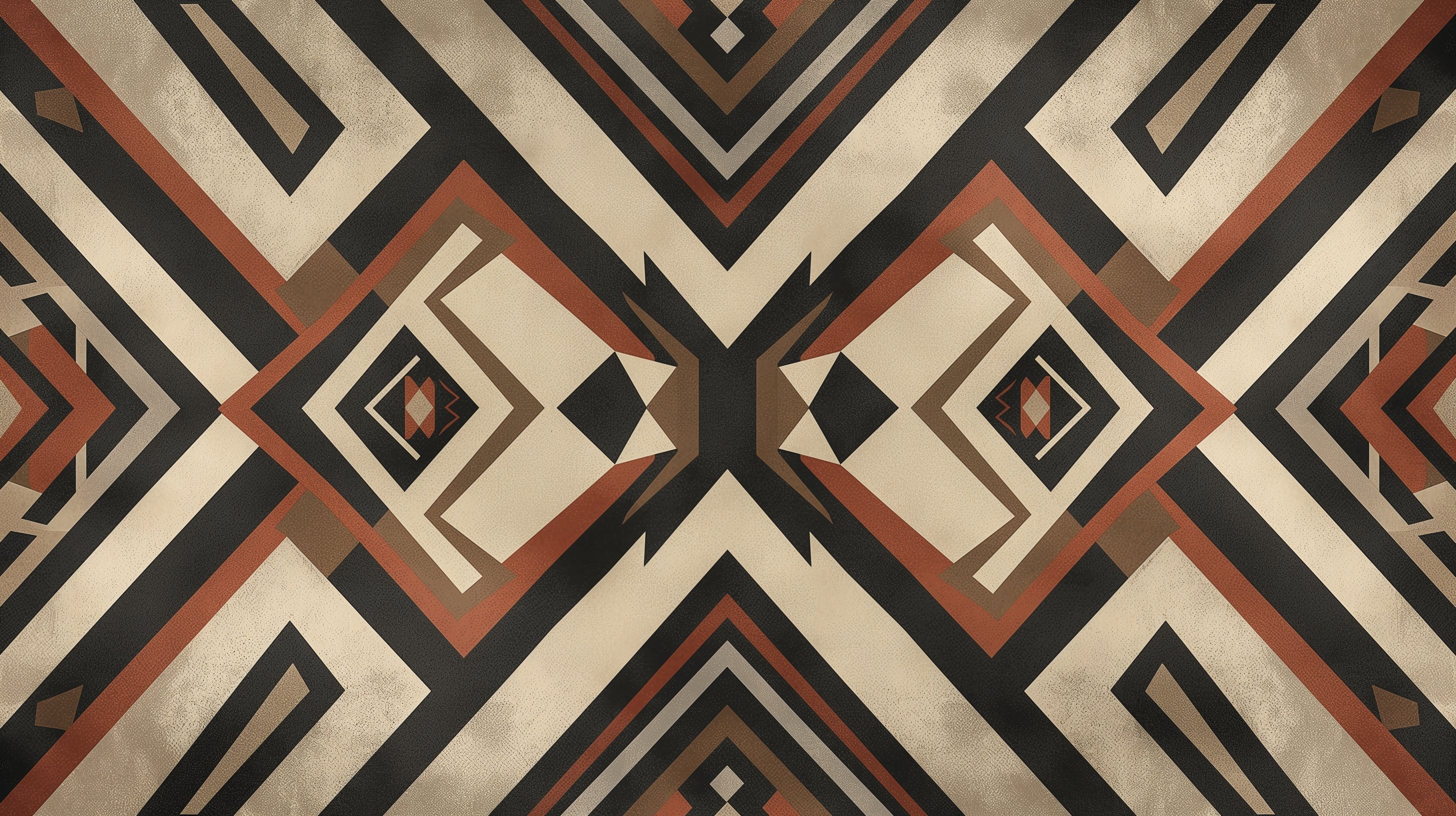 Deze geometrische muurschildering behang toont een opvallend symmetrisch patroon waar gedurfde hoeken en strakke lijnen elkaar kruisen in een betoverende weergave. De verfijnde compositie bevat een harmonieuze mix van terracotta, beige en diepzwarte tinten, wat een krachtig art deco behang creëert dat de aandacht trekt. Elke geometrische vorm is nauwkeurig gepositioneerd en vormt een ingewikkeld doolhof van diamanten en hoekige vormen die elkaar in perfecte balans spiegelen.