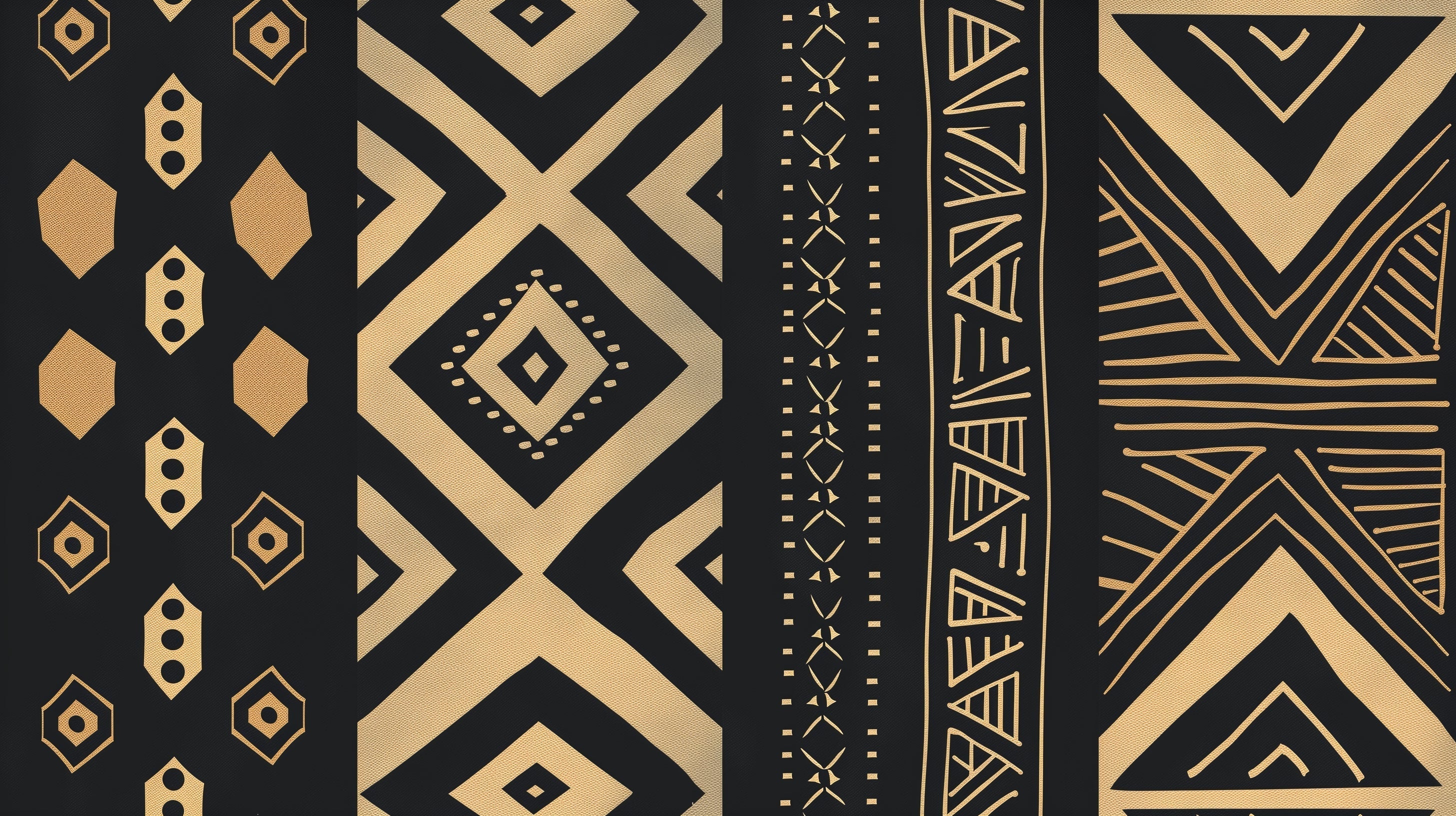 Deze geometrische tribale behang toont een verfijnde wisselwerking van gedurfde Afrikaans-geïnspireerde motieven uitgevoerd in stralend goud tegen een diep zwarte achtergrond. Het ontwerp bevat een opvallende reeks geometrische patronen kunstig gerangschikt in verticale banden, elk met kenmerkende elementen van diamantvormen en hoekige kruisen tot ingewikkelde gestippelde details en lineaire composities. De precieze rangschikking creëert een harmonieuze ritme die zowel moderne ontwerpgevoelens als oude artistieke tradities weerspiegelt.