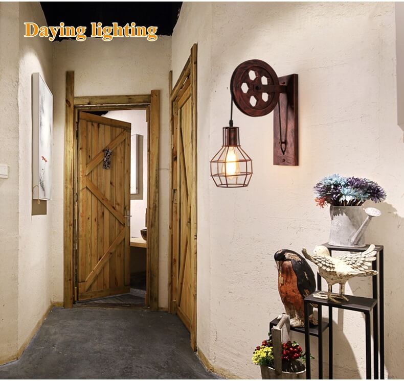Verfraai je interieur met een moderne en stijlvolle sfeer met deze industriële wandlamp. Met een vintage katrolontwerp met een ijzeren kooi lampenkap en rustieke houten bevestiging, is deze wandlamp perfect om gangen, woonkamers of slaapkamers te verlichten met een industriële touch en warm licht.